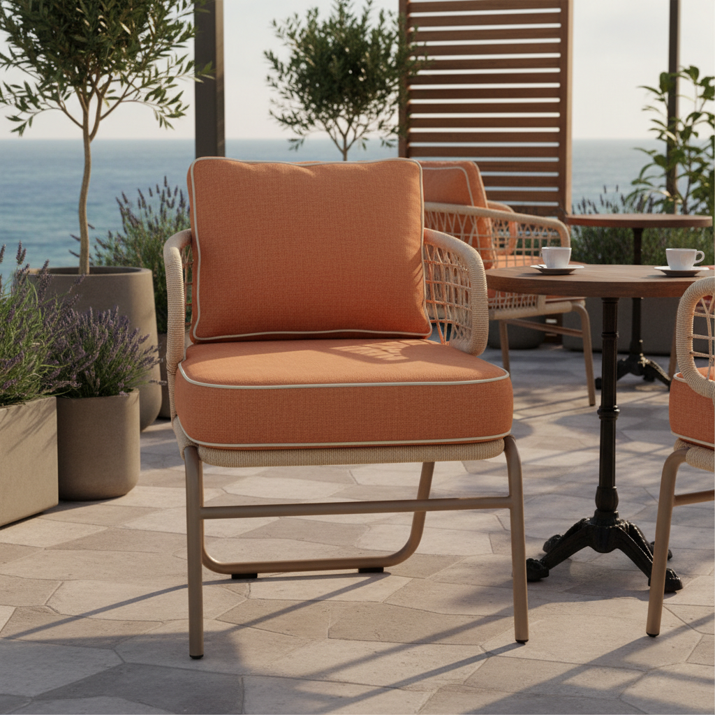 Bahçe ve teras dekorasyonunuzun vazgeçilmezi olacak bu lüks dış mekan konfor sandalyesi ile tanışın. Modern tasarımı, dayanıklı metal iskeleti ve zarif bej ip örgüsü ile dikkat çeker. Özellikle kalın, koyu antrasit/siyah renkli, su itici kumaştan üretilmiş minderleri sayesinde uzun süreli, yüksek seviyede oturma konforu sağlar. Kenar biye detayları şıklığı tamamlarken, paslanmaya karşı güçlendirilmiş yapısı sayesinde yıllarca balkon, veranda ve havuz başı keyfinize eşlik eder. Hem sandalye konforunu hem de koltuk rahatlığını tek üründe sunar, dış mekan oturma alanlarınız için idealdir.