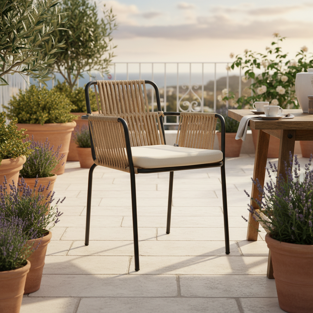 Sandalyeler kategorisinin dış mekan konforunu yeniden tanımlayan bu özel tasarım, sağlamlığı ve estetiği birleştiriyor. Siyah, paslanmaya karşı dayanıklı metal iskelet üzerine doğal jüt havası veren sentetik iplerle örülmüş sırt ve kol dayama alanlarına sahiptir. Bu sandalye, minimalist ve modern çizgileri sayesinde bahçe yemek masası etrafında veya dinlenme köşelerinizde kusursuz bir görünüm sunar. Kalın, suya dayanıklı ve UV korumalı bej/khaki minderi, uzun süreli kullanımlarda bile maksimum rahatlık sağlar. Kafe, restoran ve otellerin yanı sıra, kişisel balkon ve terasların havasını değiştirmek isteyenler için ideal, dört mevsim dayanıklı bir sandalyedir.