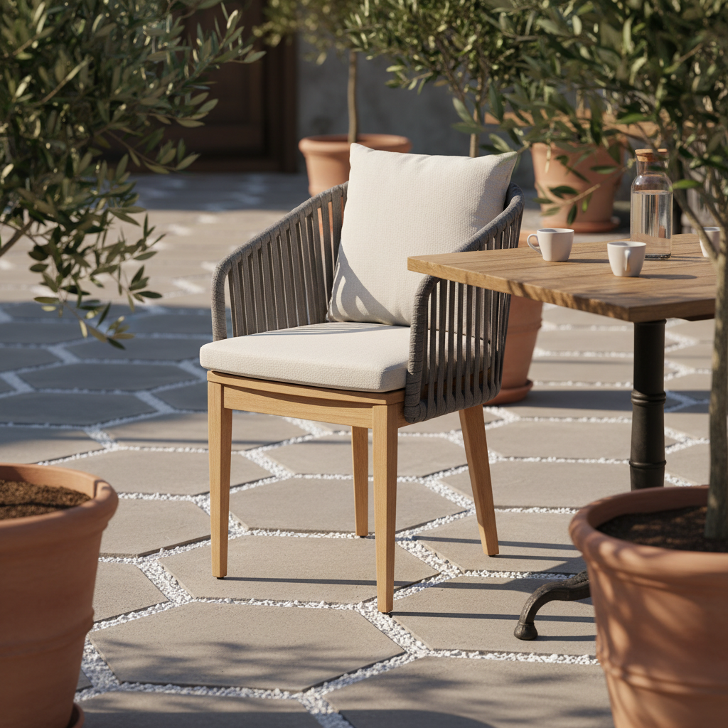 Estetiği ve dayanıklılığı birleştiren bu halat örgü sandalye, dış mekan oturum çözümleri arayanlar için idealdir. Sağlam ahşap iskeleti, zarif gri tonlarda halat örgü kolçak ve sırt detayıyla tamamlanmıştır. Kalın ve lüks hissettiren, su itici özelliğe sahip gri minderleri (oturma ve sırt yastığı) ile maksimum konfor sağlar. Sandalyeler kategorisinde olmasına rağmen, hava koşullarına dayanıklı yapısı sayesinde balkon, teras, bahçe veya kafe gibi yoğun kullanımlı dış alanlarda yıllarca şıklığını korur. Modern tasarımıyla her türlü dekorasyon stiline kolayca uyum sağlar.