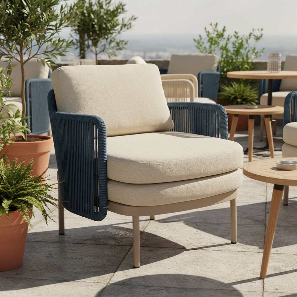Klasik sandalyelerin ötesinde, size özel bir dinlenme köşesi sunan bu lüks dış mekan sandalyesi, modern bahçe mobilyası koleksiyonunuzun yıldızı olacak. Kum beji rengindeki sağlam alüminyum iskeleti ve derin lacivert tondaki, UV ışınlarına dirençli ip (rope) örgü detayları ile eşsiz bir stil sunar. Bu tekli sandalye, kalın ve ekstra yumuşak antrasit minderleri sayesinde uzun süreli oturumlarda bile maksimum konfor vaat eder. Teras, balkon ya da havuz kenarı için mükemmel bir oturma çözümü arayanlar için tasarlandı. Zorlu hava koşullarına karşı üstün dayanıklılığı sayesinde dört mevsim dış mekan sandalyesi olarak idealdir; sadece bir sandalye değil, yeni favori dinlenme noktanız.