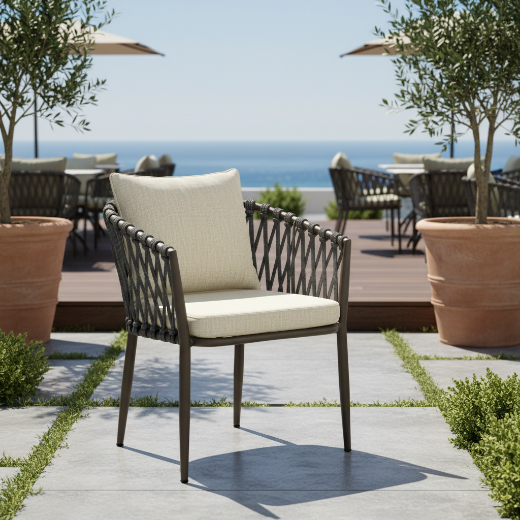 Akdeniz'in huzurunu ve şıklığını dış mekanlarınıza taşıyan Thalia Kollu İp Örgülü Sandalye ile tanışın. Modern tasarımı, sağlam metal iskeleti ve hava koşullarına dayanıklı özel ip örgüsü sayesinde hem estetik hem de fonksiyonellik sunar. Konforlu minderleriyle yaz akşamlarınızı veya gündüz kahvelerinizi eşsiz bir keyfe dönüştürerek, misafirlerinizi ağırlamak için ideal bir atmosfer yaratın.