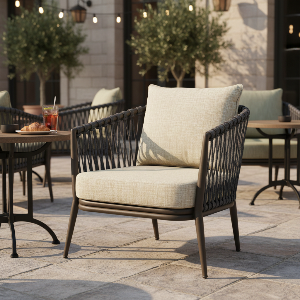 Zema Kollu Örme Koltuk ile dış mekanlarınıza modern bir dokunuş katın. Konforlu kumaş minderleri ve dayanıklı halat örgü detaylarıyla bu şık koltuk, huzurlu anların yeni adresi olacak. Zarafeti ve sağlamlığı bir araya getiren tasarımıyla mekanlarınızda unutulmaz bir atmosfer yaratın.