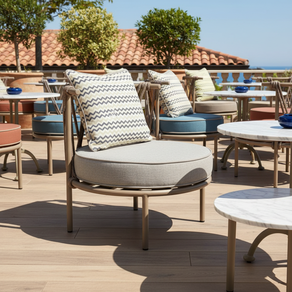 Dış mekanlarınıza zarafet ve konfor katmak için tasarlanan bu özel koltuk, örme detayları ve sağlam metal iskeletiyle göz kamaştırıyor. Geniş ve konforlu minderiyle uzun sohbetlerinize eşlik ederken, estetik tasarımıyla her anınıza huzur katıyor. Güneşin ve manzaranın tadını çıkarırken şıklık ve rahatlık arayanlar için mükemmel bir seçim.