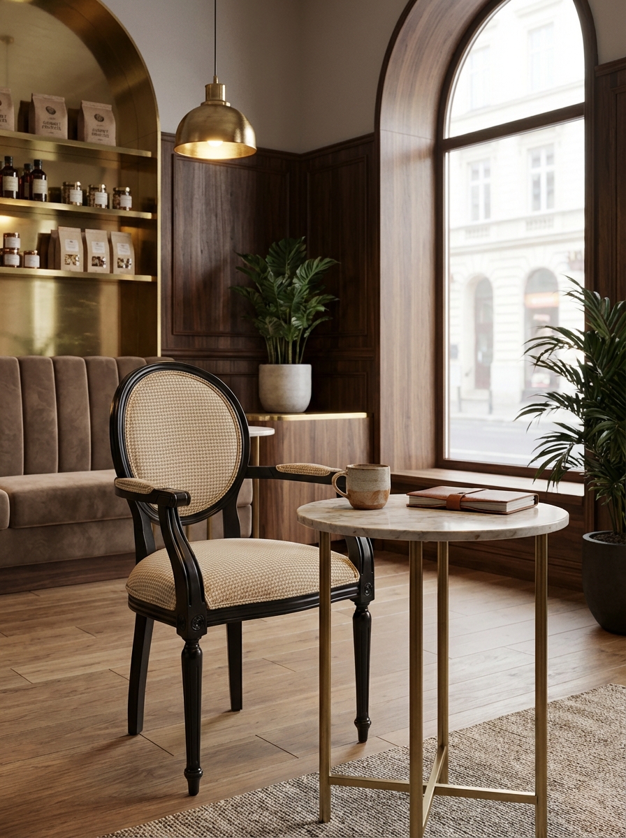 Zarif hatları ve konforlu kumaş döşemesiyle mekanlarınıza asil bir dokunuş katın. Dayanıklı ahşap iskeleti ve ergonomik kolçaklarıyla uzun süreli keyifli anlar sunar. Hem şık yemek alanlarınızda hem de çalışma masalarınızda estetik ve rahatlığı bir araya getiren bu özel tasarım, zamansız bir atmosfer yaratır.