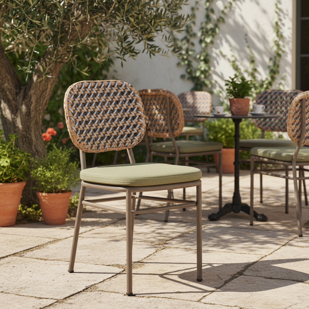 Estetik ve dayanıklılığı bir araya getiren bu çok amaçlı sandalye, hem evinizin hem de ticari mekanlarınızın (kafe, restoran) gözdesi olacak. Güçlü ve uzun ömürlü metal iskeleti üzerine inşa edilmiştir ve iç/dış mekan kullanımına tamamen uygundur. Sırt kısmındaki sentetik rattan örgüler; kahverengi, gri ve beyaz tonlardaki benzersiz deseniyle rustik ve modern tarzları harmanlar. Oturma yüzeyindeki kalın, çıkarılabilir bej/gri minder sayesinde uzun süreli oturumlarda bile maksimum konfor sağlar. Mutfak masaları ve balkon takımları için ideal, kolay temizlenebilir bir oturma çözümüdür.