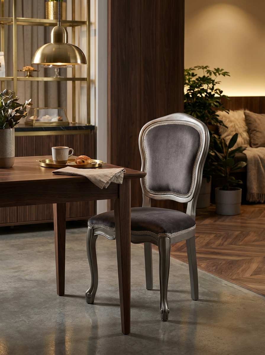 Müşteri deneyiminizi zirveye taşımak ve yatırımınızın değerini maksimize etmek isteyen işletmeler için tasarlandı. Monarch Yemek Sandalyesi, Barok/Rokoko estetiğinin zamansız zarafetini, ticari alanların talep ettiği operasyonel dayanıklılıkla birleştirir. Antik gri (füme) cilalı masif ahşap çerçevesi, yüksek yaya trafiğine karşı yıllarca sürecek sağlamlığı garanti eder. Koyu kahve kadife döşemesi, lüks ve konfor sunarken, profesyonel temizliğe uyumu sayesinde operasyonel maliyetlerinizi düşürür. Mimari projelerinizde veya satın alma kararlarınızda, kenar çivi detayları ve kabriole ayaklar ile sağlanan premium algı, misafir memnuniyetini ve işletmenizin marka değerini artırır. Uzun ömürlülük, kolay bakım ve estetik mükemmelliği bir arada arayan B2B profesyonelleri için ideal çözümdür, amortisman süresini optimize eder.