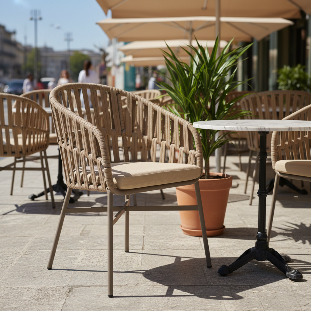 Bu modern örme kollu sandalye ile dış mekanlarınıza zarafet ve konfor katın. Dayanıklı metal iskeleti ve şık örme detayları, uzun süreli kullanım için ideal bir denge sunar. Balkonunuzda, terasınızda veya bahçenizde keyifli anlar yaratmak için tasarlanmıştır, turuncu kumaş minderi ise sıcak bir dokunuş ekler.