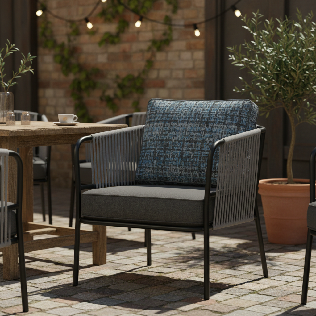Pera Kollu İp Örgülü Koltuk ile dış mekanlarınızda stil ve konforu bir araya getirin. Modern metal çerçevesi ve zarif ip örgü detaylarıyla dikkat çeken bu koltuk, kalın ve rahat minderleriyle eşsiz bir dinlenme deneyimi sunar. Akşam yemeklerinden keyifli sohbetlere kadar her anınıza eşlik edecek, bahçenize veya terasınıza sofistike bir dokunuş katacak mükemmel bir seçim.