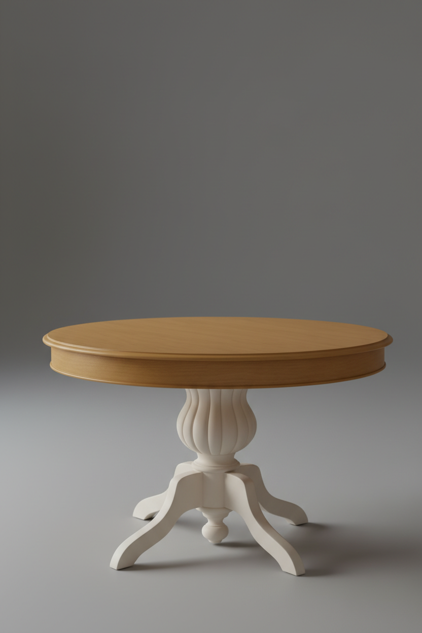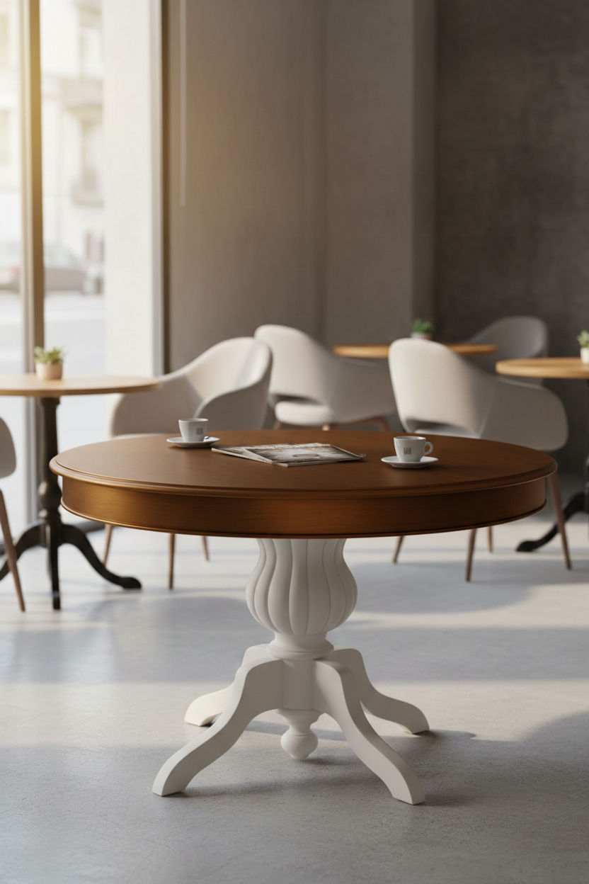 Evinizin veya işletmenizin atmosferini anında yükseltecek bu zarif yuvarlak ahşap masa, klasik oymalı tek ayak detayıyla göz kamaştırıyor. Doğal ahşap tablası ve estetik duruşuyla sıcak ve davetkar bir buluşma noktası yaratırken, sağlam yapısıyla uzun yıllar keyifli anılarınıza eşlik edecek. Kahve keyiflerinden samimi yemek davetlerine kadar her anınıza sofistike bir dokunuş katın.