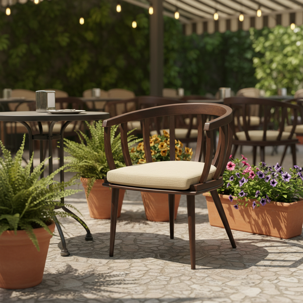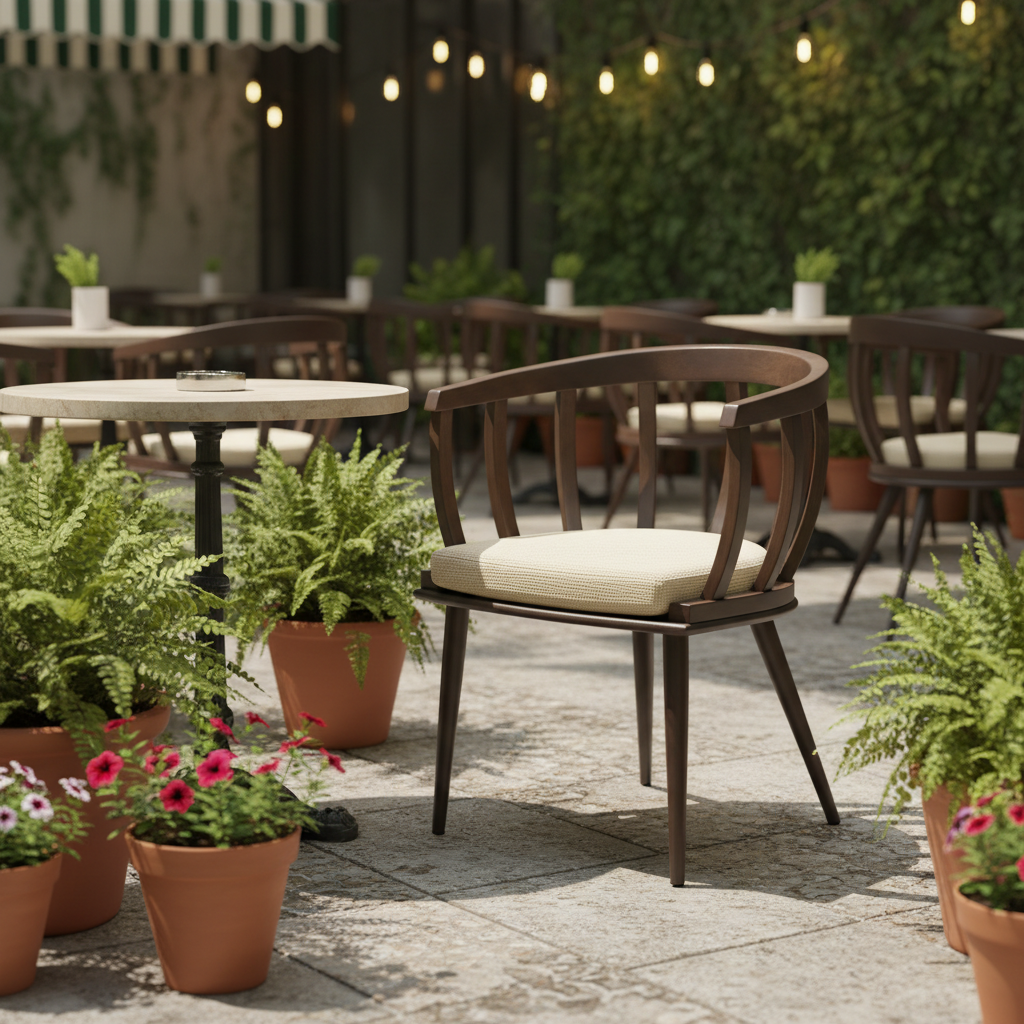Kora Ahşap Kollu Kumaş Minderli Sandalye ile açık alanlarınıza zarafet ve konfor katın. Ergonomik kolları ve yumuşak kumaş minderi sayesinde uzun sohbetlerin keyfini çıkarırken, dayanıklı ahşap iskeleti ile mekanınıza doğal bir sıcaklık getirir. Hem iç hem dış mekanlarda şıklığı ve rahatlığı bir arada arayanlar için ideal bir seçim.