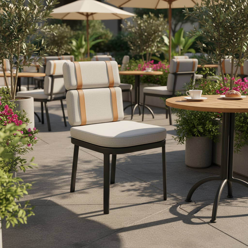 Yemek odanıza veya mutfağınıza çağdaş bir dokunuş katın. Bu eşsiz sandalye, dayanıklı mat siyah metal iskeleti üzerine oturan konforlu, kalın gri kumaş minderlere sahiptir. En dikkat çekici özelliği, sandalyeye lüks bir hava katan ve ergonomik sırt yastıklarını saran dikey taba rengi deri (veya suni deri) kayış detaylarıdır. İki parçalı sırt tasarımı sayesinde uzun süreli oturmalarda dahi maksimum destek ve rahatlık sunar. Modern, İskandinav veya Endüstriyel dekorasyon stillerine kolayca uyum sağlar. Misafirlerinizi rahatça ağırlayabileceğiniz, yüksek standartlı ve uzun ömürlü bir oturma çözümüdür.