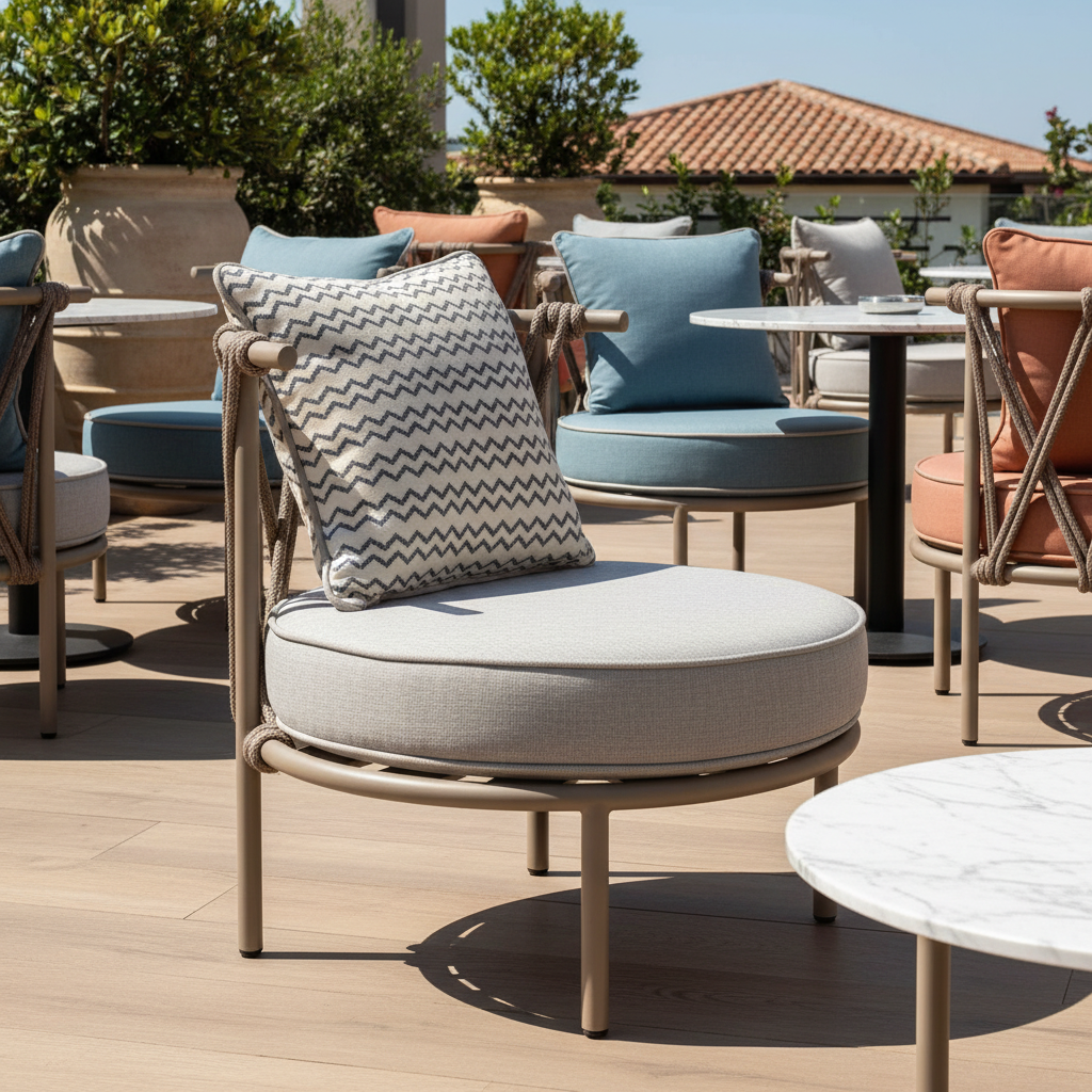Dış mekanlarınıza zarafet ve konfor katmak için tasarlanan bu özel koltuk, örme detayları ve sağlam metal iskeletiyle göz kamaştırıyor. Geniş ve konforlu minderiyle uzun sohbetlerinize eşlik ederken, estetik tasarımıyla her anınıza huzur katıyor. Güneşin ve manzaranın tadını çıkarırken şıklık ve rahatlık arayanlar için mükemmel bir seçim.