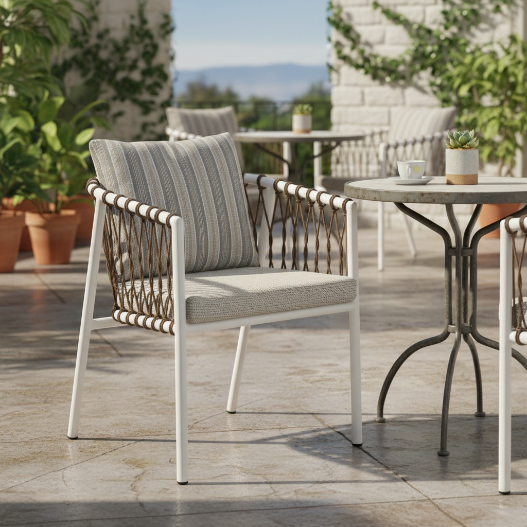 Modern dış mekan yaşam alanlarınız için tasarlanan bu şık sandalye, estetik ve dayanıklılığı birleştiriyor. Paslanmaya karşı dirençli beyaz elektrostatik boyalı sağlam metal iskeleti ve hava koşullarına dayanıklı kahverengi sentetik ip dokuma detayları ile yıllarca güvenle kullanabilirsiniz. Suya ve güneşe karşı korumalı, kalın ve yumuşak oturma minderi (ayrıca çizgili sırt yastığı) sayesinde Sandalye konforunu dış mekanda lüks bir seviyeye taşıyor. Balkon, teras ya da bahçenizdeki oturma düzenini tamamlayacak, rahatlık arayanlar için ideal bir seçimdir. Kafe ve restoran gibi işletmeler için de dayanıklı ve stil sahibi bir alternatiftir.