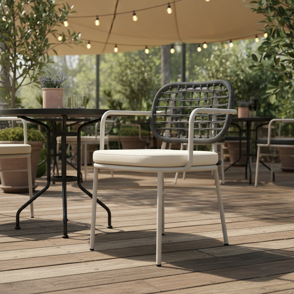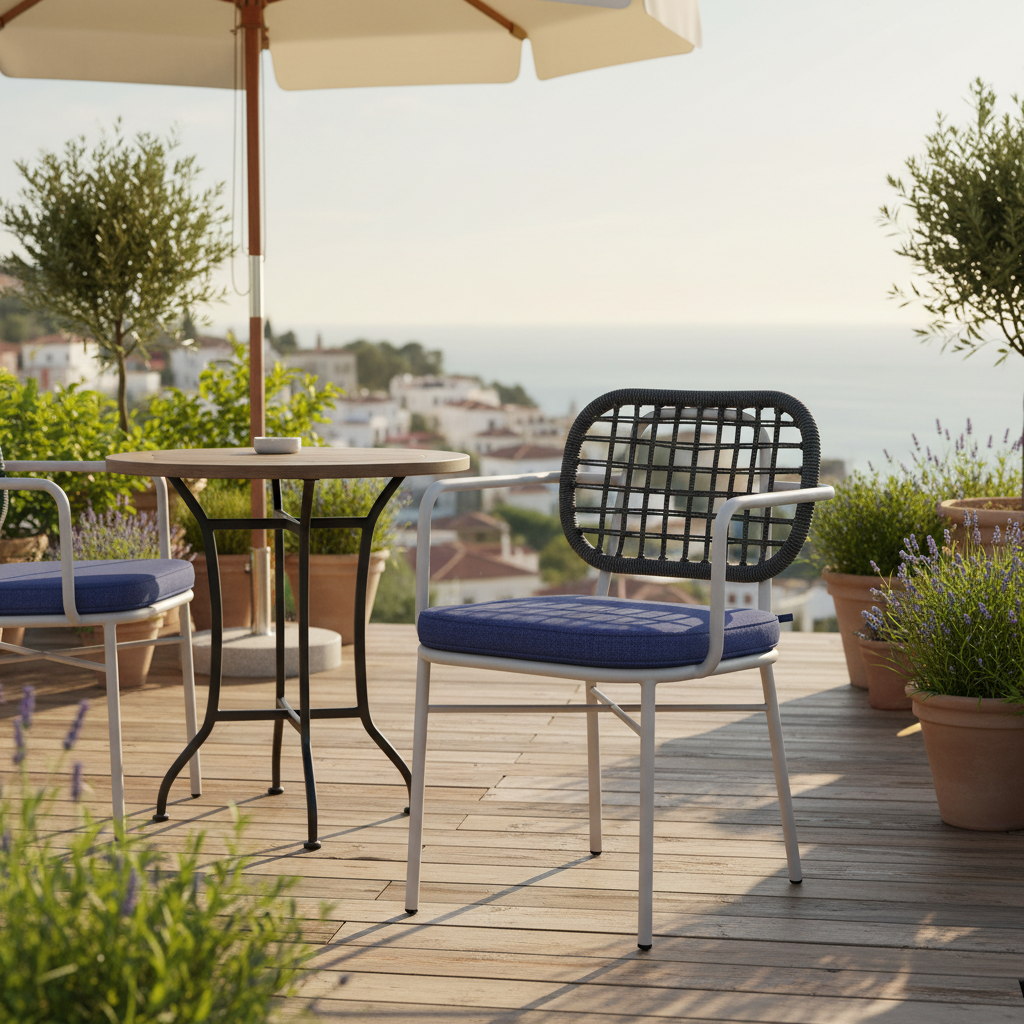 Arven Kollu Örme Sandalye ile açık hava deneyiminizi yeniden tanımlayın. Ergonomik tasarımı ve sağlam metal gövdesiyle uzun süreli konfor sunarken, zarif örme sırtlığı modern ve şık bir atmosfer yaratır. Teraslarınızda, bahçelerinizde veya balkonlarınızda Akdeniz ruhunu yansıtan bu sandalye ile unutulmaz anlar yaşayın, yaşam alanlarınıza değer katın.