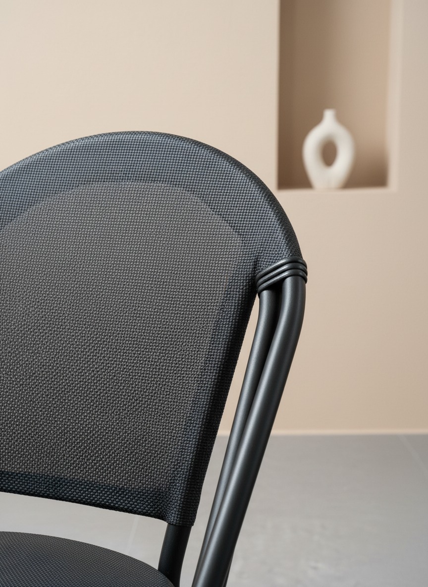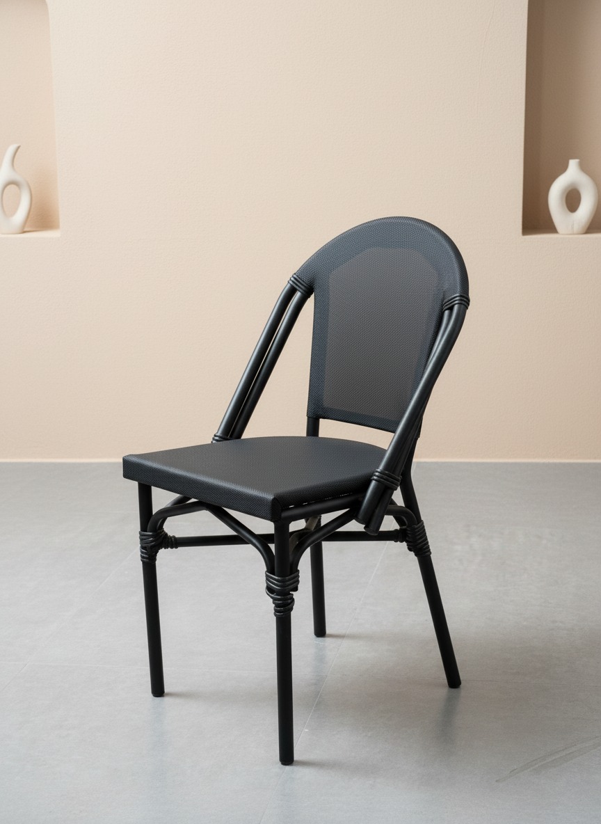 Zarif tasarımı ve dayanıklı yapısıyla hem iç mekan hem de dış mekan kullanımına uygun bistro sandalye. Ergonomik sırt yapısı ve hafif alüminyum gövdesi sayesinde kafe, restoran ve bahçeler için ideal bir kullanım sunar. Hava koşullarına karşı dirençli materyallerden üretilmiştir.