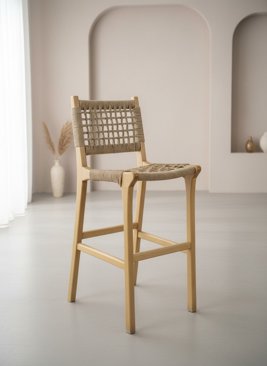Dayanıklı masif ahşap iskeleti, el işçiliği ile titizlikle örülmüş hasır oturum ve sırt bölgesiyle birleştiren bu bar sandalyesi, mekanlarınıza doğal bir sıcaklık katar. Ergonomik sırt desteği ve sağlam ayak yapısı sayesinde hem evlerdeki ada mutfaklar hem de ticari işletmeler için uzun ömürlü ve konforlu bir kullanım sunar. Bohem, rustik ve modern dekorasyon stilleriyle mükemmel uyum sağlar.