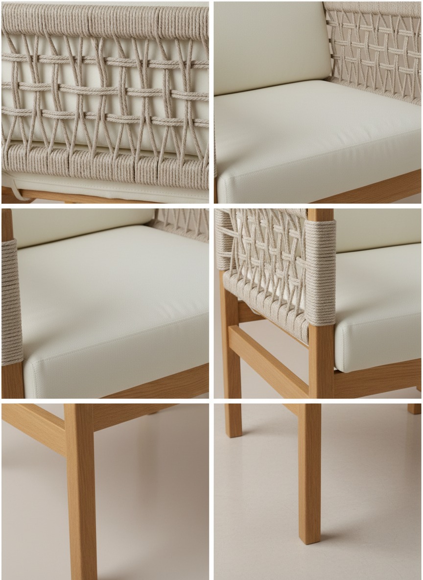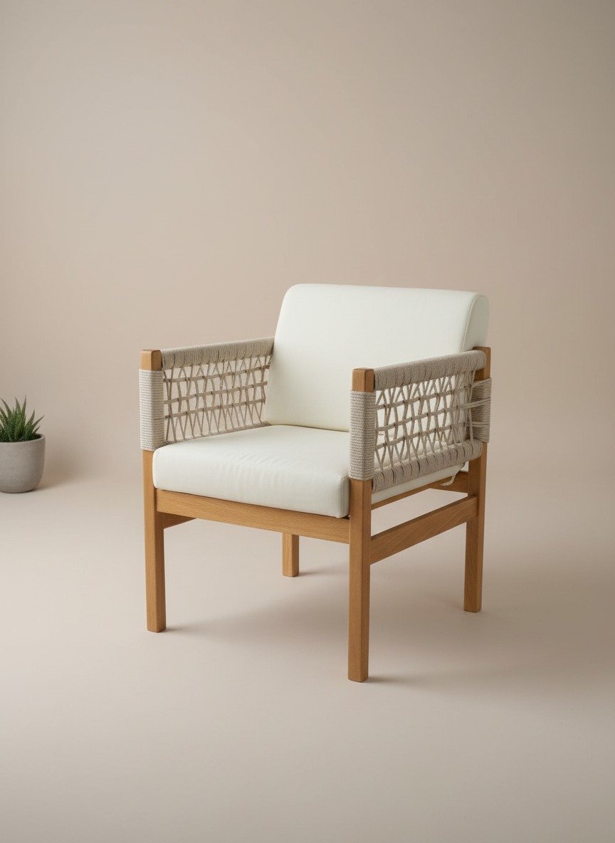 Doğal ahşap iskeleti ve estetik el örgüsü ip detaylarıyla tasarlanmış bu koltuk, hem iç mekan hem de dış mekan kullanımı için mükemmel bir konfor sunar. Dayanıklı yapısı ve ergonomik sırt minderi ile balkon, bahçe veya salonunuzun en şık parçası olmaya adaydır.