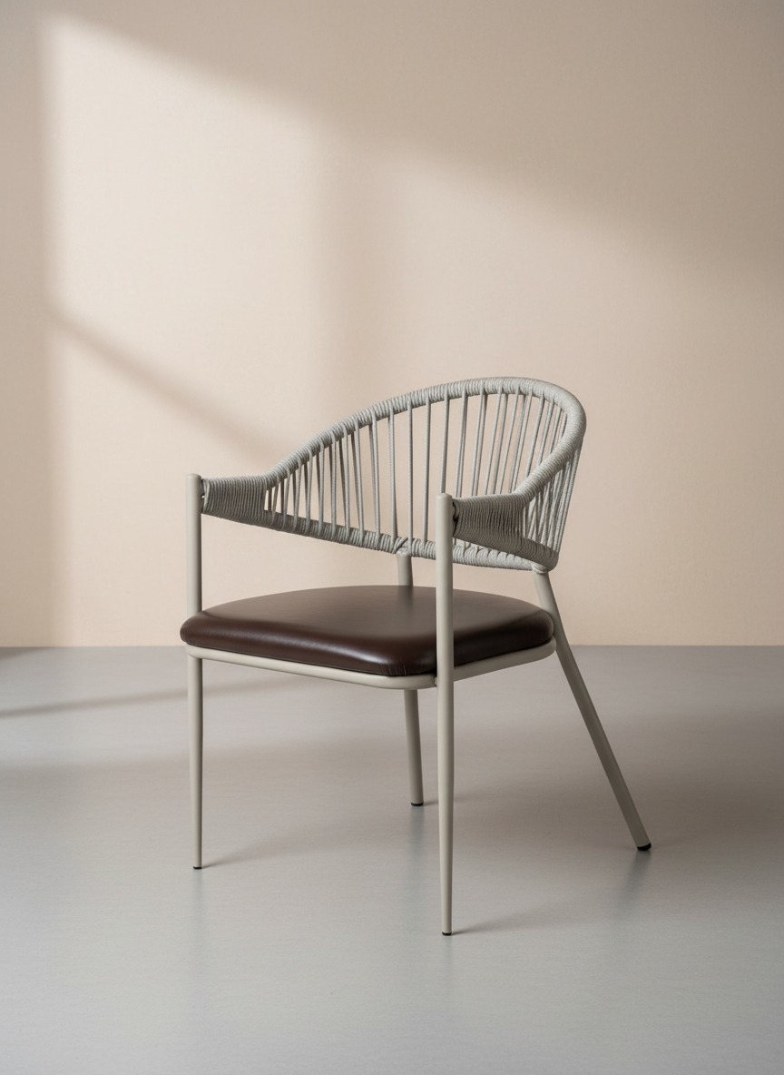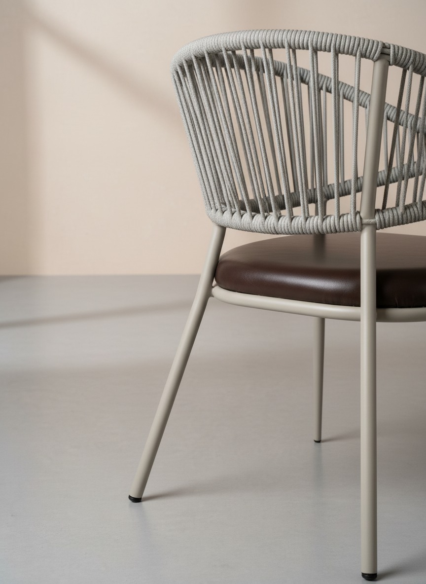 Dikey ip örgü sırt tasarımıyla modern bir estetik sunan bu sandalye, sağlam metal iskeleti ve konforlu minderli oturum alanı ile öne çıkar. Hem iç mekan hem de yarı açık dış mekan kullanımına uygun olan bu tasarım, otel, kafe ve ev dekorasyonları için dayanıklılık ve şıklığı bir arada sunar.