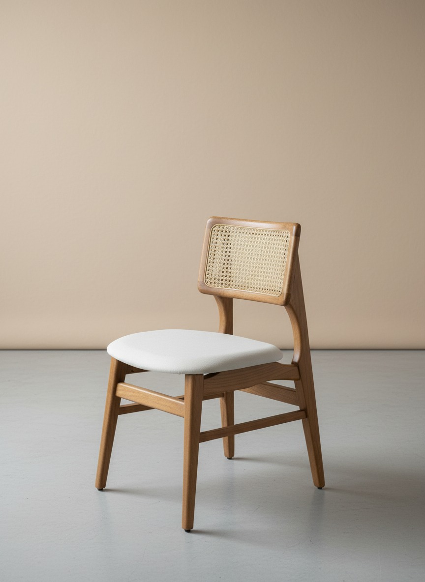 Doğal ahşap işçiliği ile üretilen bu sandalye, sırt kısmındaki geleneksel hazeran örgüsü ve ergonomik kavisli yapısıyla hem klasik hem de modern mekanlara uyum sağlar. Yumuşak dolgulu oturma alanı uzun süreli konfor sunarken, sağlam iskeleti dayanıklılığı garanti eder.