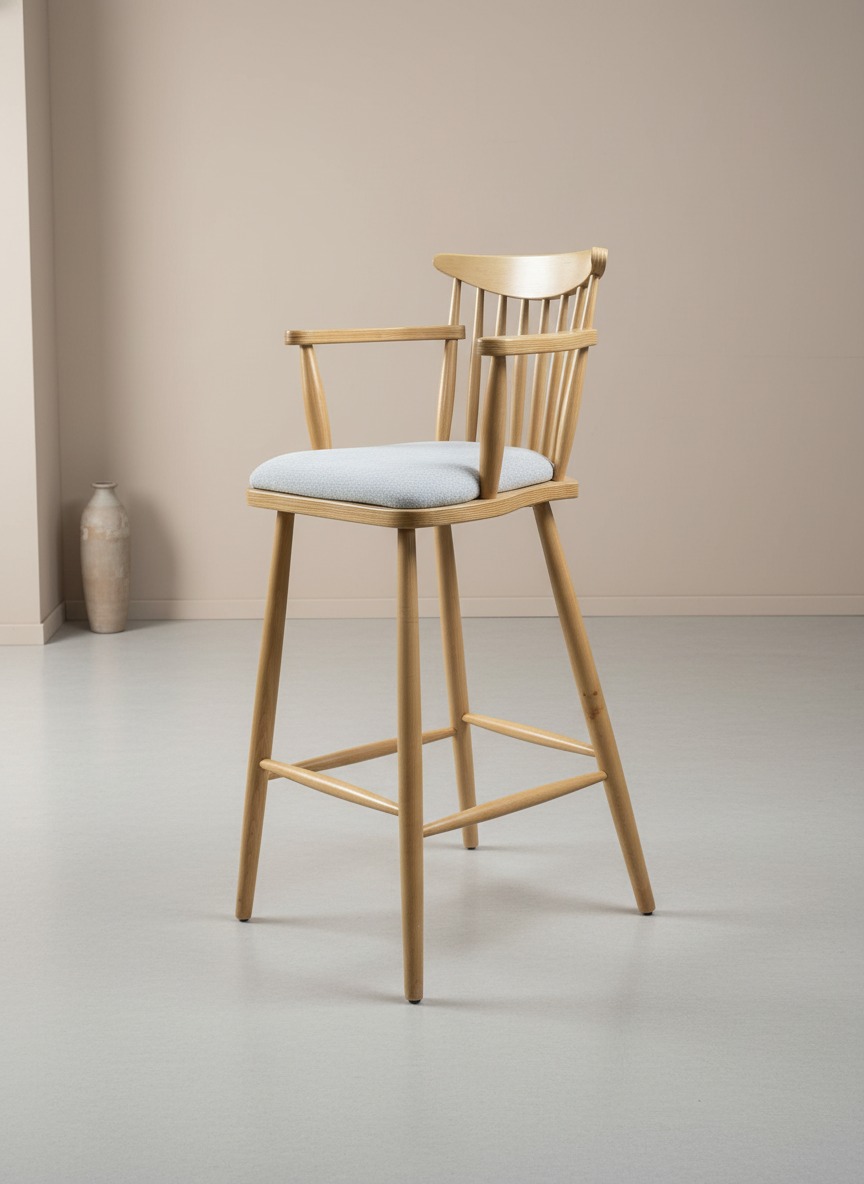 Yüksek kaliteli masif ahşap malzemeden üretilen bu bar sandalyesi, ergonomik sırt desteği ve konforlu kolçak yapısıyla öne çıkıyor. Hem evlerdeki mutfak adaları hem de kafe ve restoran projeleri için ideal olan ürün, dayanıklı yapısı ve zamansız tasarımıyla mekanınıza doğal bir şıklık katar.