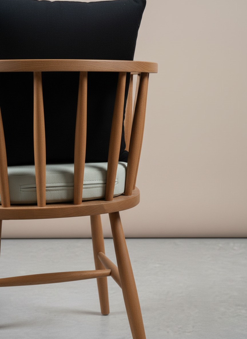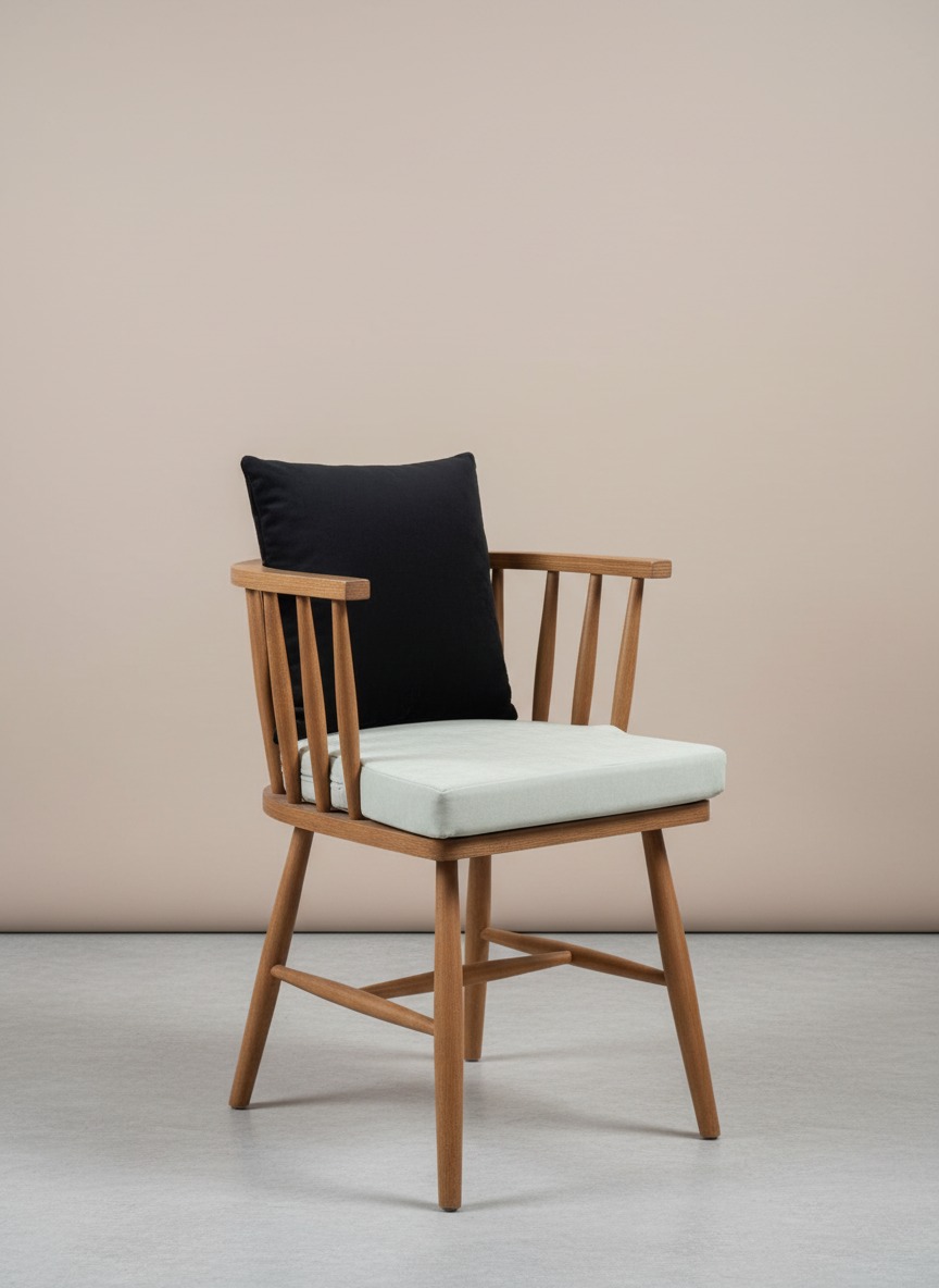 Zarif kavisli sırt yapısı ve dikey ahşap çıtalarıyla öne çıkan bu kolçaklı sandalye, masif ahşabın doğal dokusunu yaşam alanlarınıza taşır. İskandinav tasarım anlayışıyla harmanlanan sağlam iskeleti, hem konforlu bir oturum sunar hem de estetik bir dekorasyon objesi olarak işlev görür. Yemek masaları, çalışma köşeleri veya kafe/restoran kullanımı için ideal dayanıklılıktadır.