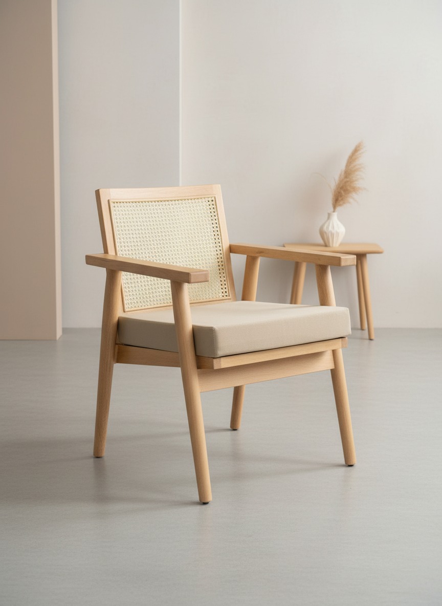 Doğal ahşap işçiliği ile modern tasarımı birleştiren bu hazeranlı koltuk, yaşam alanlarınıza hem konfor hem de estetik katar. Dayanıklı ahşap gövdesi ve geleneksel hazeran örgüsü sırt kısmı ile zamansız bir dekorasyon parçasıdır.