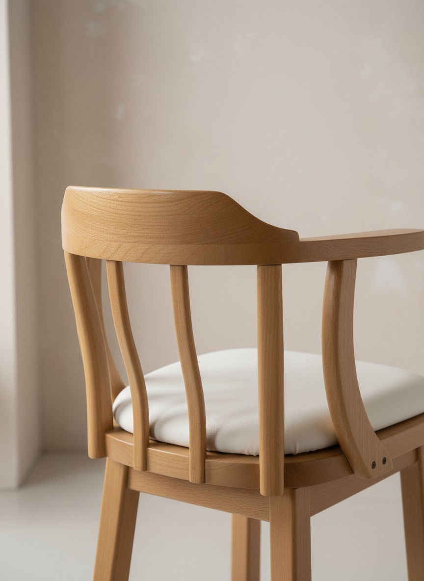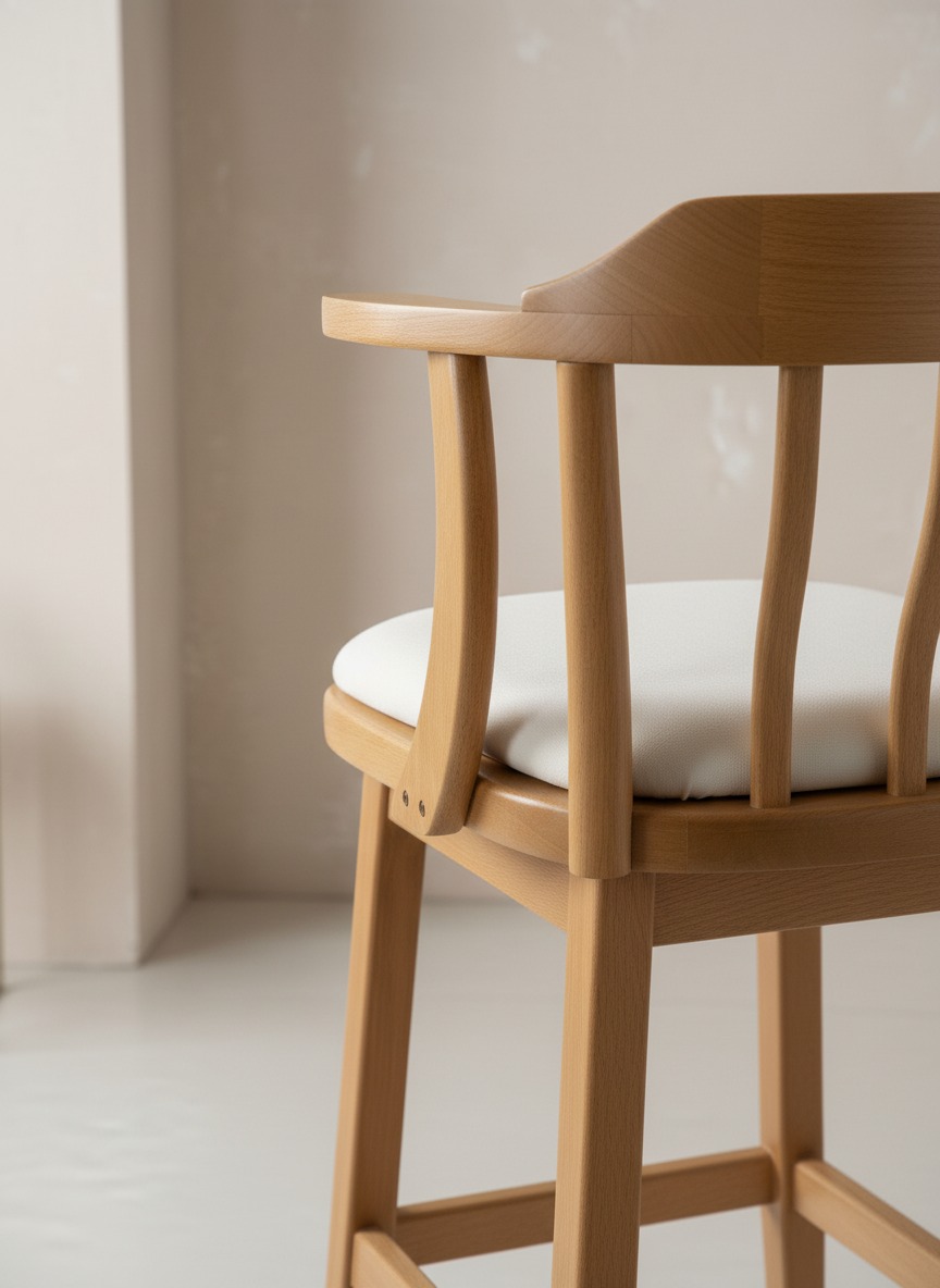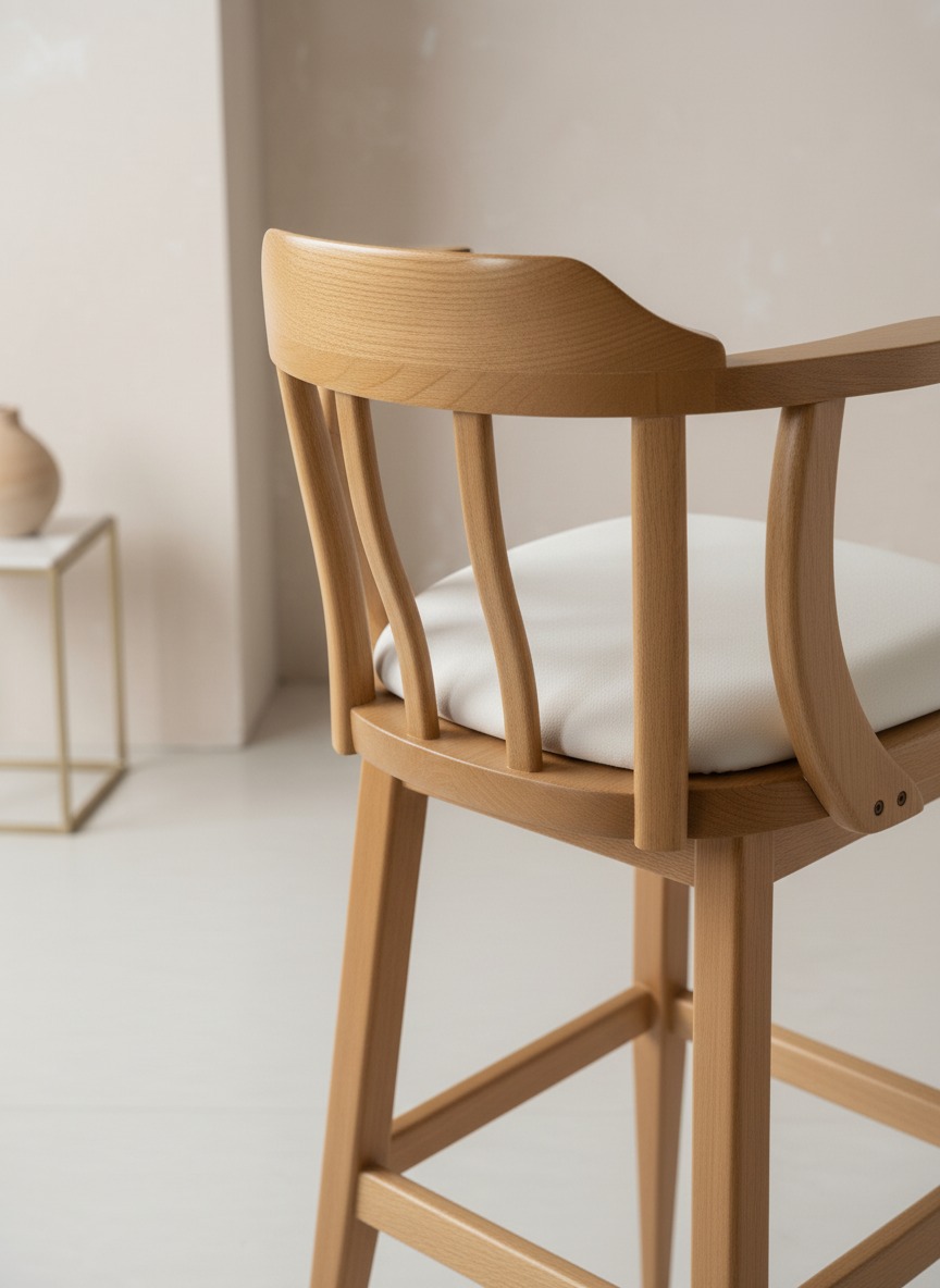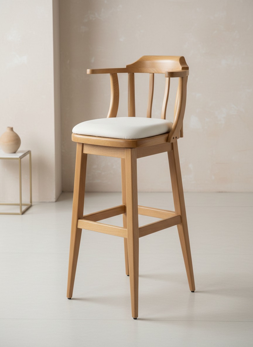 Doğal ahşap dokusuyla sıcak bir atmosfer sunan, ergonomik sırt ve kol desteğine sahip bar sandalyesi. Mutfak adaları, bar alanları ve yüksek masalar için tasarlanmış dayanıklı yapısı, şıklığı konforla birleştirir.