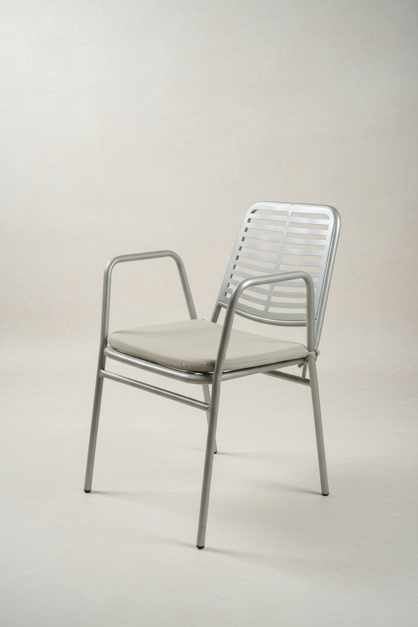 Dayanıklı metal gövdesi ve ergonomik tasarımıyla öne çıkan bu kollu sandalye, hem iç hem de dış mekanlar için idealdir. Yatay şeritli sırt tasarımı ve konforlu oturma minderi ile şıklığı ve rahatlığı bir arada sunar. Kafe, restoran ve bahçe kullanımı için uzun ömürlü bir tercihtir.