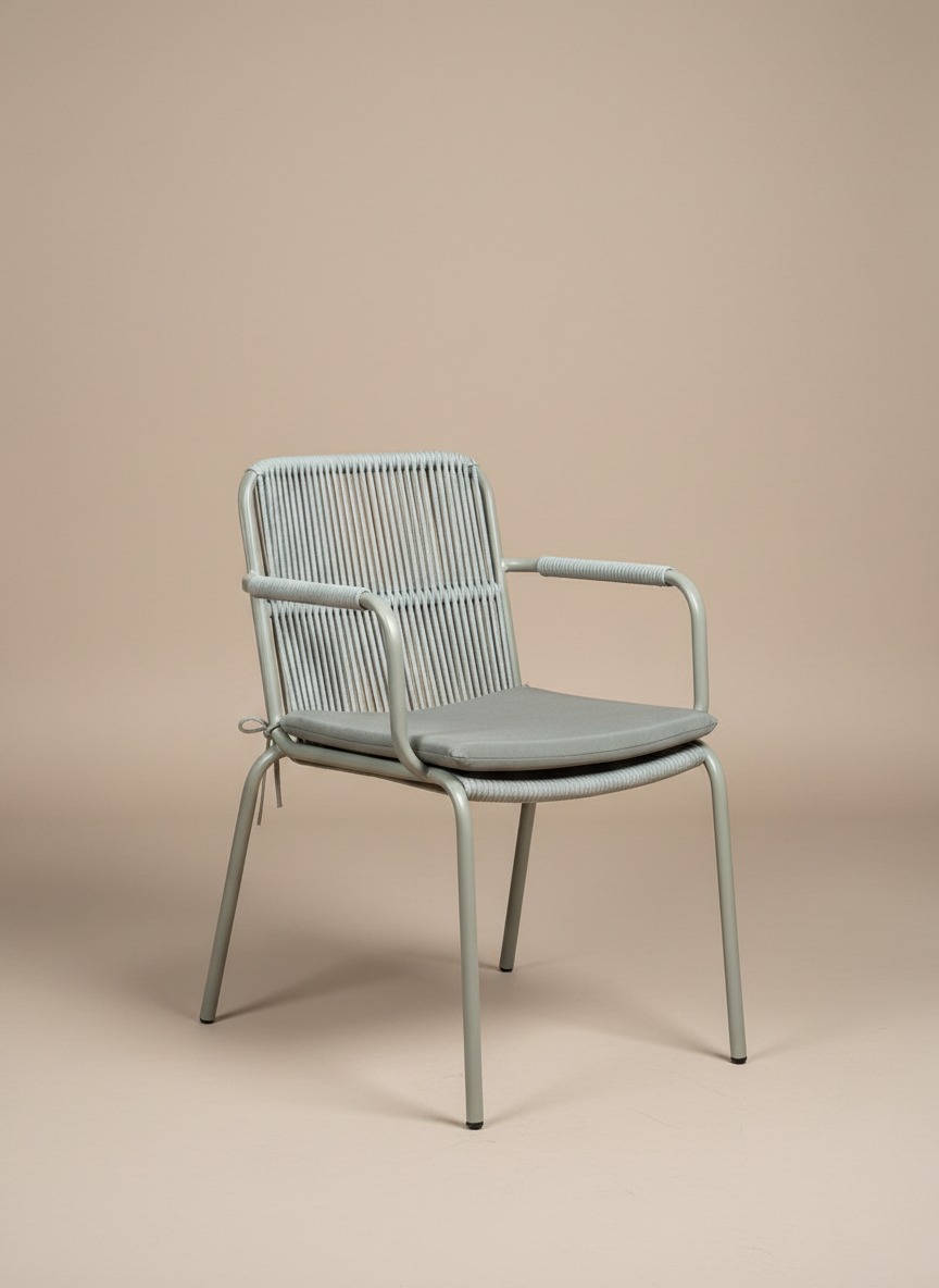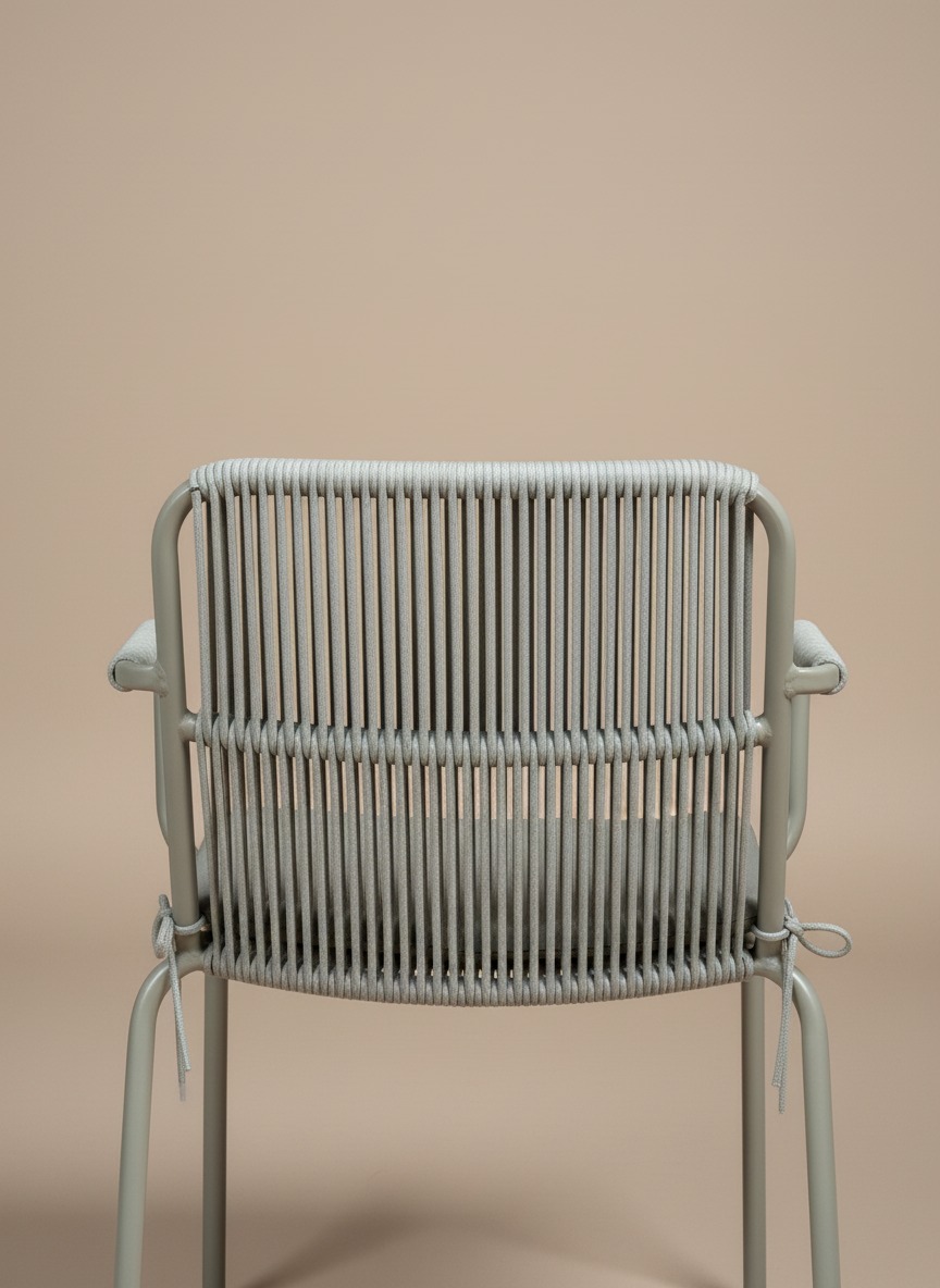 Estetik ip örgü detayları ve dayanıklı metal iskeleti ile hem iç hem dış mekan kullanımına uygun, konforlu minderli tasarım sandalye. Minimalist çizgileriyle bahçe, balkon ve kafe dekorasyonları için idealdir.