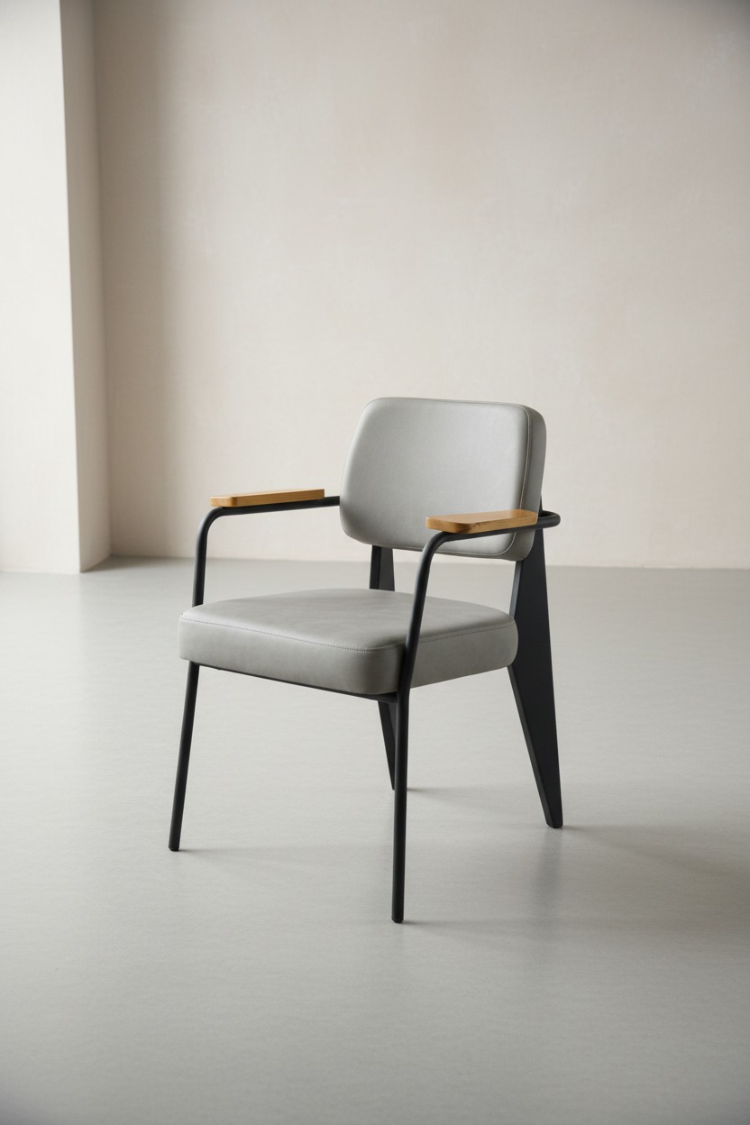 Modern ve endüstriyel çizgilerin birleşimi olan bu sandalye, sağlam siyah metal iskeleti ve doğal ahşap kolçak detaylarıyla öne çıkmaktadır. Ergonomik sırt yapısı ve geniş oturma alanı ile uzun süreli kullanımlarda konfor sağlar. Arka ayaklardaki ikonik geniş panel tasarımı hem estetik bir görünüm hem de ekstra stabilite sunar.
