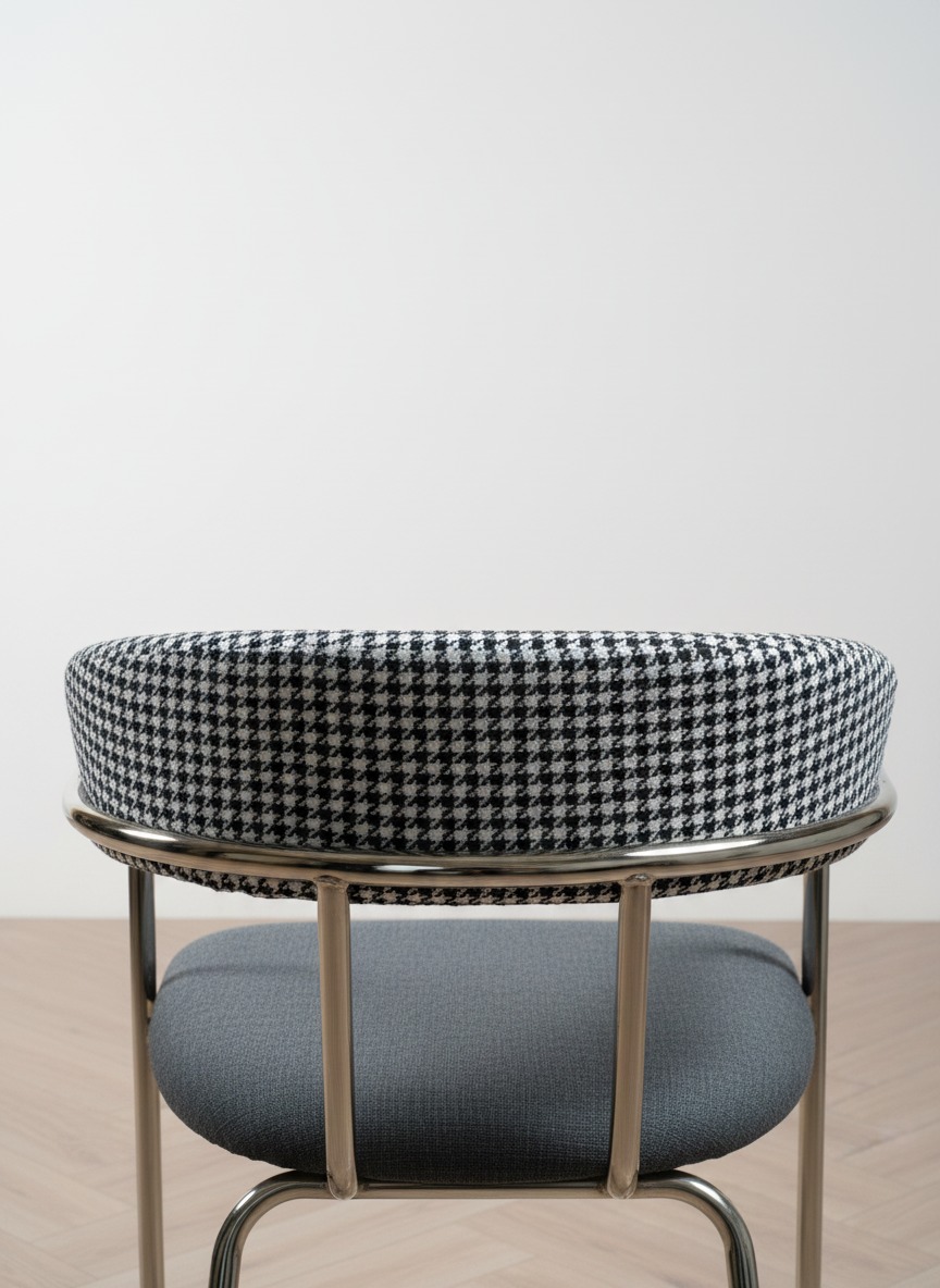 Zarif metal iskeleti ve kavisli sırt yapısı ile hem estetiği hem de konforu bir arada sunan bu sandalye, modern iç mekan tasarımları için idealdir. İkonik desenli sırt döşemesi ve dayanıklı yapısı ile ev, ofis veya restoran kullanımına uygundur.