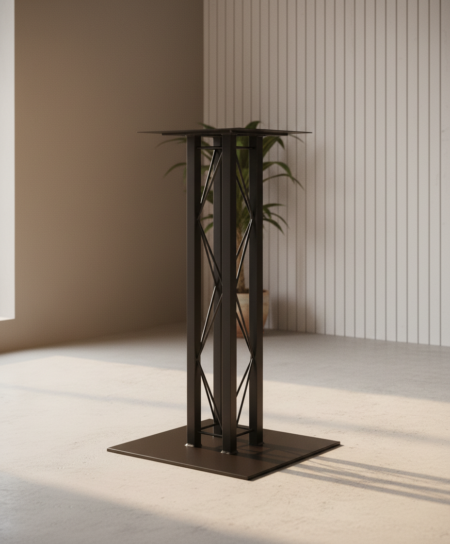 Modern ve endüstriyel tarzda tasarlanmış, yüksek tip (bar/bistro) masalar için ideal metal masa ayağıdır. Sağlam çelik konstrüksiyonu ve çapraz destekli (truss) kolon yapısı sayesinde maksimum denge ve dayanıklılık sunar. Kare alt taban plakası ve üst montaj plakası, farklı masa tablalarıyla kolayca entegre edilebilir. Kafe, restoran, otel ve modern ev bar alanları gibi ticari ve yoğun kullanıma uygun mekanlar için mükemmel bir seçimdir. Mat siyah renkte boyanmıştır.