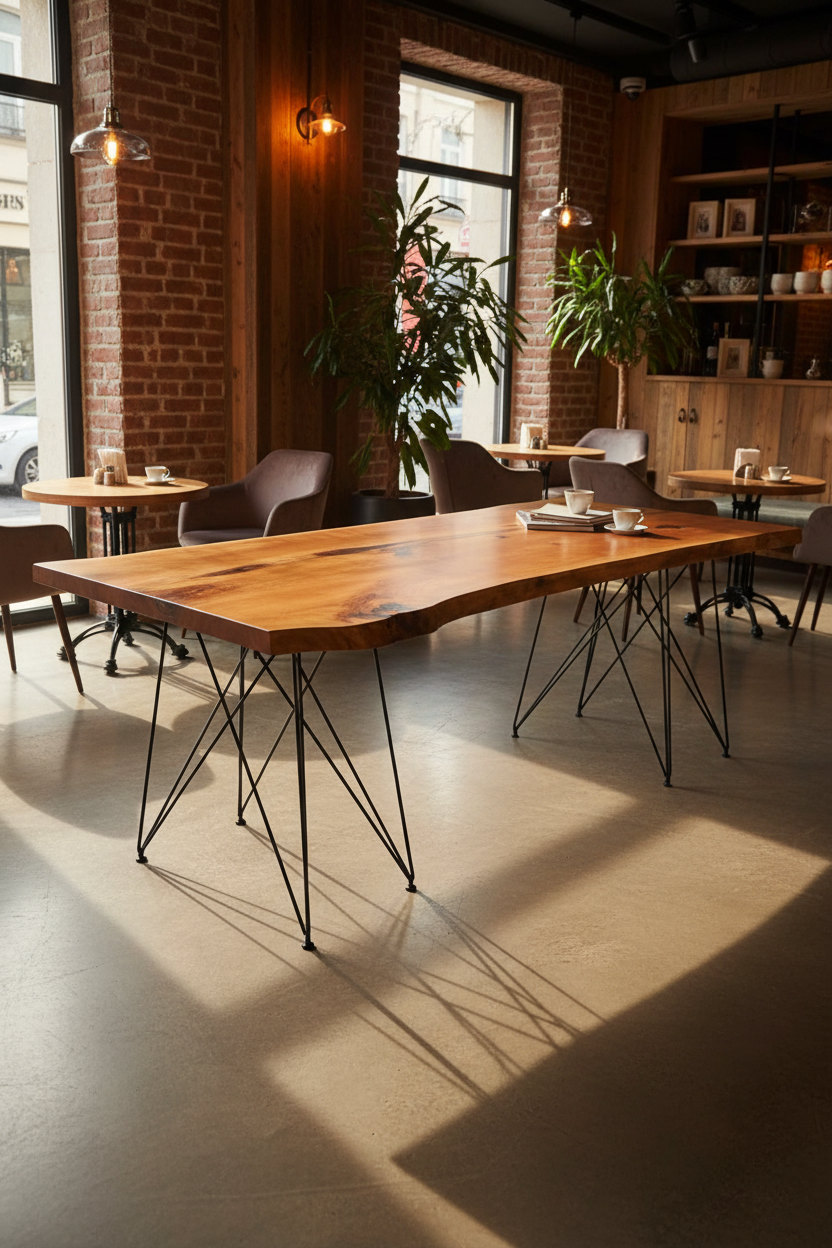 Premium müşteri deneyimini ve operasyonel verimliliği maksimize etmek isteyen HORECA işletmeleri, mimarlar ve satınalma profesyonelleri için tasarlanmıştır. Gastro Slab Elite Serisi, doğal ahşabın eşsizliğini koruyan canlı kenar (live edge) masif tabla ile mekanınıza anında prestij katarken, misafirlerinizin 'premium algısını' pekiştirir. Bu masa, yoğun ticari kullanıma karşı geliştirilmiş özel koruyucu katman sayesinde çizilme ve lekelere karşı üstün direnç gösterir; bu da kolay temizlenebilirlik ve minimum bakım maliyeti anlamına gelir. Uzun ömürlü yapısı, sık yenileme ihtiyacını ortadan kaldırarak yatırımınızın geri dönüşünü (ROI) maksimize eder. Mat siyah geometrik tel ayaklar, endüstriyel estetiği sağlamlıkla buluşturarak masif ahşabın ağır duruşunu modern bir hafiflikle dengeler. Projelerinizde kalıcı bir etki yaratmak ve kurumsal güvenilirliği vurgulamak için idealdir.