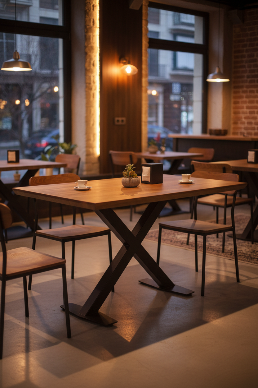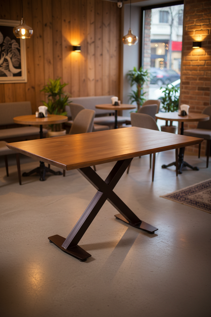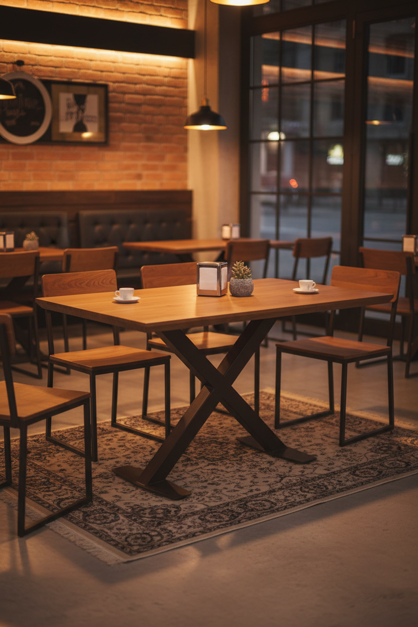 Yoğun ticari trafiğe dayanıklı mobilya çözümü arayan işletme sahipleri, mimarlar ve satınalma müdürleri için tasarlanmıştır. Stabilis X Masa Takımı, doğal masif ahşabın sunduğu premium algıyı, endüstriyel X ayak konstrüksiyonunun sarsılmaz sağlamlığı ile birleştirir. Operasyonel verimlilik ve müşteri deneyimi önceliğimizdir: Yüksek kalitede kaplaması sayesinde kolay temizlenebilirlik ve leke direnci sunar, temizlik maliyetlerini minimize eder. Uzun ömürlü yapısı, sık mobilya değiştirme maliyetini ortadan kaldırarak işletmenizin sermayesini korur ve net bir yatırım getirisi (ROI) sağlar. Misafirleriniz için sofistike ve güvenilir bir ortam yaratmak adına idealdir.