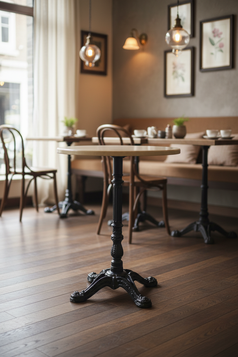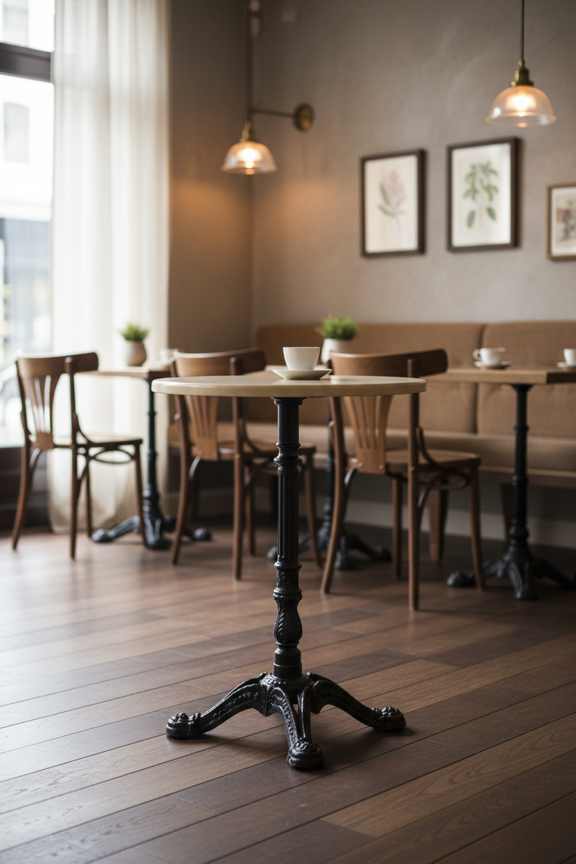 İşletmenizin atmosferini yükseltirken operasyonel maliyetleri düşürmeyi hedefleyin. Parisien Serisi, yoğun müşteri trafiğine dayanacak şekilde tasarlanmıştır. Ağır ve sağlam siyah döküm demir ayak ve sütun detayı, devrilme riskini minimuma indirerek hem iç hem de dış mekanlarda kurumsal güvenilirlik ve uzun ömürlülük (Yatırım Getirisi) sağlar. Parlak, krem/bej tonlardaki tablası hızlı ve kolay silinebilir yapısıyla temizlik süresini kısaltır, hijyen standartlarınızın korunmasına yardımcı olur. Küçük ve yüksek yoğunluklu mekanlar için ideal olan bu zarif yuvarlak tasarım, müşterilerinize şık ve samimi, 'premium algı' sunan bir deneyim vaat eder. Mimarlar ve satınalma müdürleri için tasarlanmış, B2B dayanıklılıkta bir çözümdür.