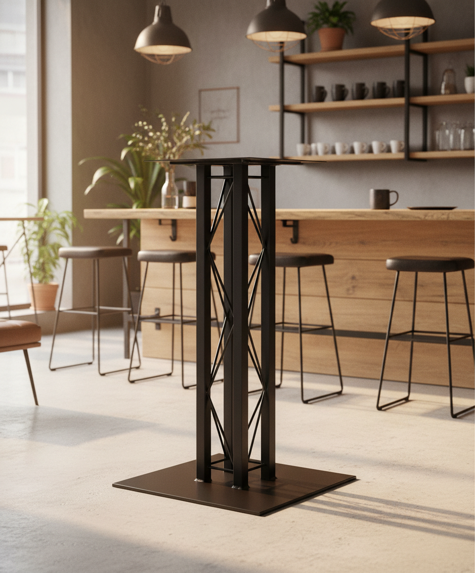 Modern ve endüstriyel tarzda tasarlanmış, yüksek tip (bar/bistro) masalar için ideal metal masa ayağıdır. Sağlam çelik konstrüksiyonu ve çapraz destekli (truss) kolon yapısı sayesinde maksimum denge ve dayanıklılık sunar. Kare alt taban plakası ve üst montaj plakası, farklı masa tablalarıyla kolayca entegre edilebilir. Kafe, restoran, otel ve modern ev bar alanları gibi ticari ve yoğun kullanıma uygun mekanlar için mükemmel bir seçimdir. Mat siyah renkte boyanmıştır.