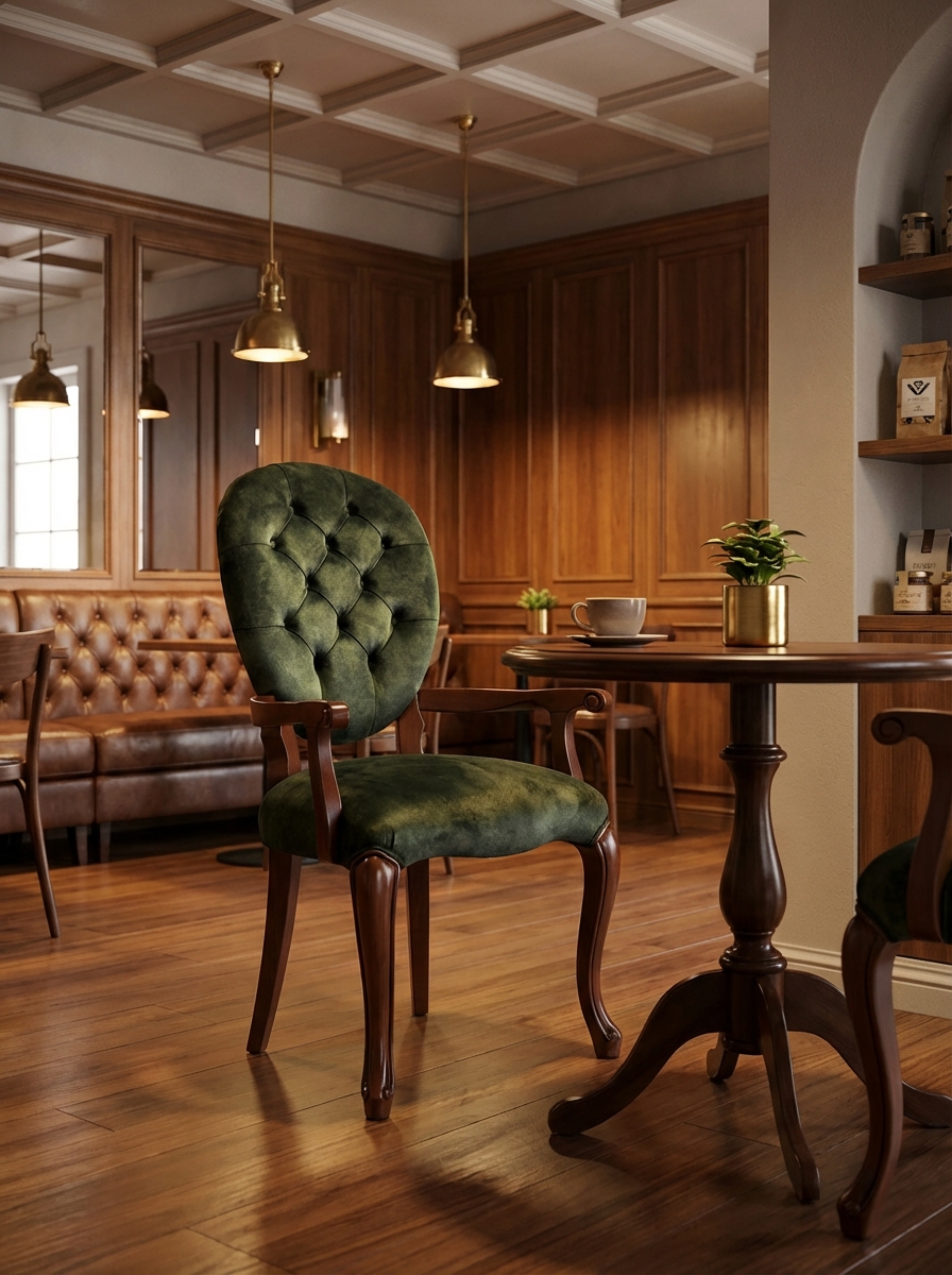Ağırlama sektörünün zorlu standartlarına göre tasarlanmış Palazzo Konfor Sandalyesi, mekanınıza anında prestij ve yatırım getirisi (ROI) katmak üzere geliştirilmiştir. İşletme sahipleri ve mimarlar için özel olarak hazırlanan bu model, misafirlerinize unutulmaz bir premium deneyim sunar. Koyu yeşil tonlardaki zarif kapitone işçiliği, mekanın algısını lüks seviyeye taşır. Uzun oturumlarda dahi konforu koruyan ergonomik yapısı, müşteri memnuniyetini ve 'dwell time'ı artırır. Tamamen ceviz tonlarında, yoğun kullanıma dayanıklı masif ahşap iskelet ve Cabriole (bombeli) ayaklar sayesinde, sık yenileme maliyetlerini ortadan kaldırarak uzun ömürlülük garantisi sunar. Kolay temizlenebilen ve leke tutmaya dirençli özel döşeme kumaşı, operasyonel maliyetleri düşürmeniz için kritik bir avantaj sağlar. Projelerinizde fark yaratacak güvenilir ve estetik bir çözümdür.