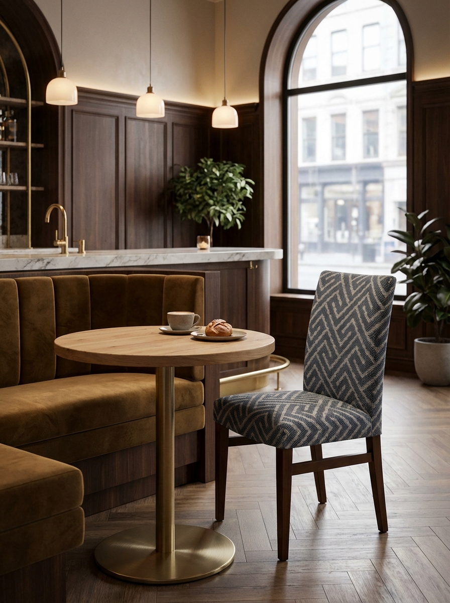 Premium işletmeler için tasarlanan Meander Contract Deluxe, müşteri memnuniyetini ve yatırım getirisini (ROI) merkeze alır. Lacivert ve açık tonların sofistike uyumuyla geometrik desenli kumaş (Yunan anahtarı/Meander) ile kaplanmıştır, bu sayede mekanınızın premium algısını hızla yükseltir. Yüksek sırt yapısı, uzun süreli oturumlarda dahi misafir konforunu garanti eder. Yoğun kullanıma dayanıklı özel döşemesi, leke tutmaz ve kolay temizlenebilir yapısıyla operasyonel maliyetleri düşürür. Koyu renkli, sağlam ahşap ayaklar ise yıllar boyu sürecek yapısal dayanıklılık sunarak, satın alma müdürlerinin beklediği uzun ömürlülük kriterini fazlasıyla karşılar. Tasarımın zamansız şıklığı sayesinde hem klasik otel lobilerinde hem de modern AVM restoranlarında kusursuz bir uyum sağlar.