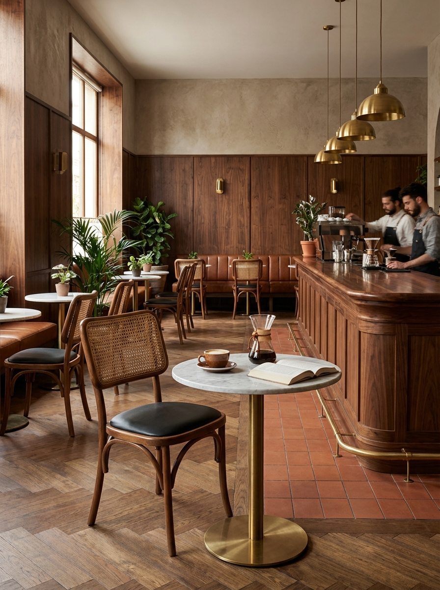 Klasik bükme ahşap (bentwood) tekniğiyle üretilmiş, sırt kısmında doğal hasır (rattan) örgüsü bulunan zarif bir sandalye modelidir. Ceviz tonlarındaki sağlam ahşap iskelet, hafif kavisli yapısıyla konforlu bir oturum sunar. Oturma yüzeyi, kolay temizlenebilir ve dayanıklı koyu renk (siyah veya antrasit) deri/suni deri ile kaplanmıştır. Zamansız tasarımı sayesinde hem modern hem de retro mekanlar, ev yemek odaları, kafeler ve restoranlar için idealdir. Bu sandalye, estetik ve dayanıklılığı bir arada sunar.