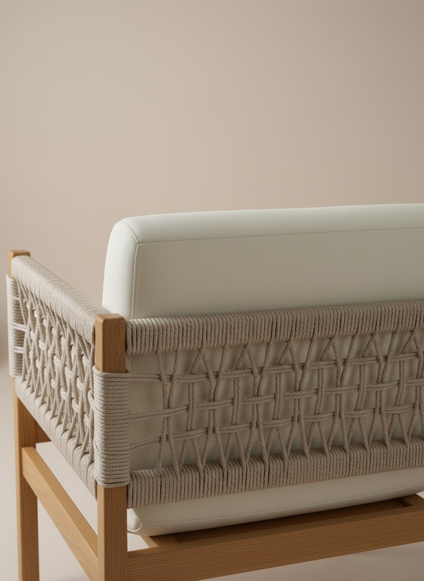 Doğal ahşap iskeleti ve estetik el örgüsü ip detaylarıyla tasarlanmış bu koltuk, hem iç mekan hem de dış mekan kullanımı için mükemmel bir konfor sunar. Dayanıklı yapısı ve ergonomik sırt minderi ile balkon, bahçe veya salonunuzun en şık parçası olmaya adaydır.