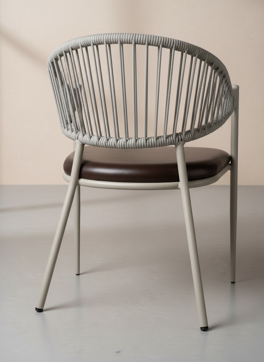 Dikey ip örgü sırt tasarımıyla modern bir estetik sunan bu sandalye, sağlam metal iskeleti ve konforlu minderli oturum alanı ile öne çıkar. Hem iç mekan hem de yarı açık dış mekan kullanımına uygun olan bu tasarım, otel, kafe ve ev dekorasyonları için dayanıklılık ve şıklığı bir arada sunar.