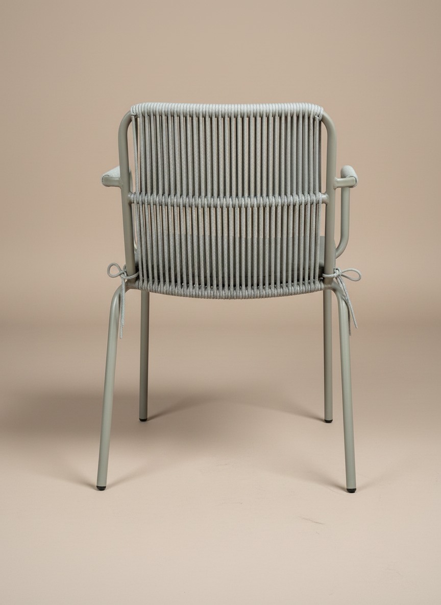 Estetik ip örgü detayları ve dayanıklı metal iskeleti ile hem iç hem dış mekan kullanımına uygun, konforlu minderli tasarım sandalye. Minimalist çizgileriyle bahçe, balkon ve kafe dekorasyonları için idealdir.