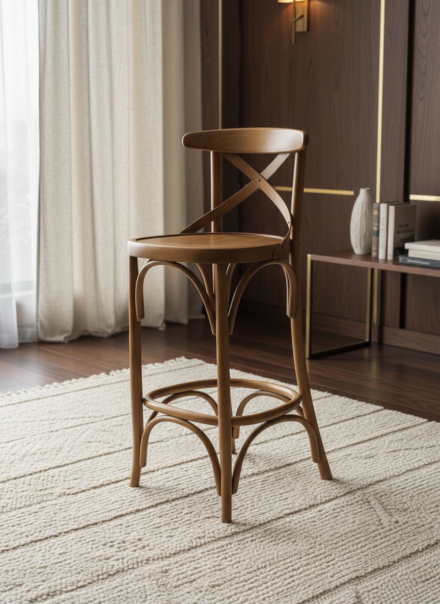 Klasik Thonet tarzını modern bir dokunuşla birleştiren bu ahşap bar sandalyesi, çapraz sırt detayı ve kavisli gövde yapısıyla hem estetik hem de dayanıklılık sunar. Mutfak adaları, barlar ve kafe işletmeleri için ideal bir oturma çözümüdür.