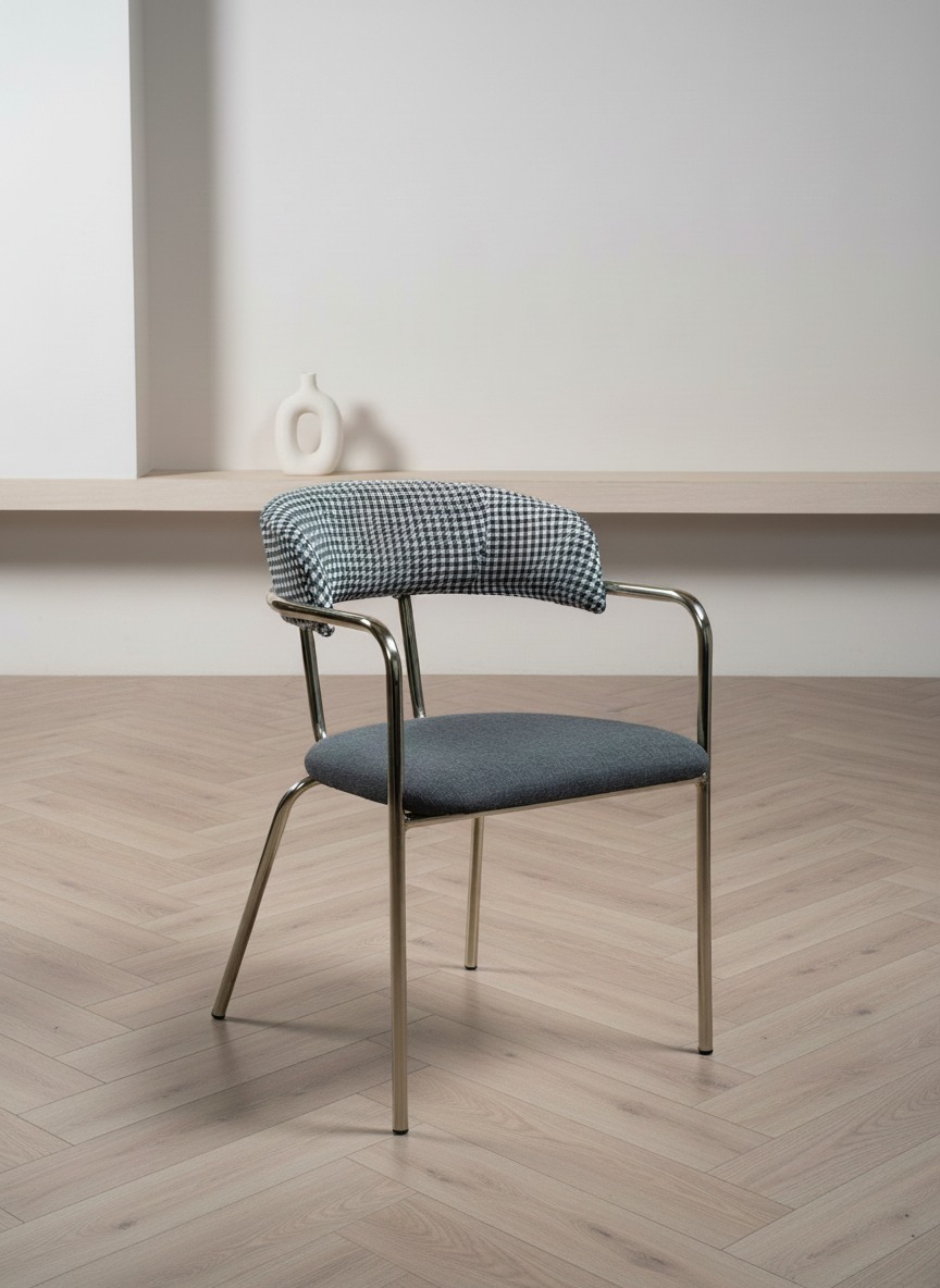 Zarif metal iskeleti ve kavisli sırt yapısı ile hem estetiği hem de konforu bir arada sunan bu sandalye, modern iç mekan tasarımları için idealdir. İkonik desenli sırt döşemesi ve dayanıklı yapısı ile ev, ofis veya restoran kullanımına uygundur.