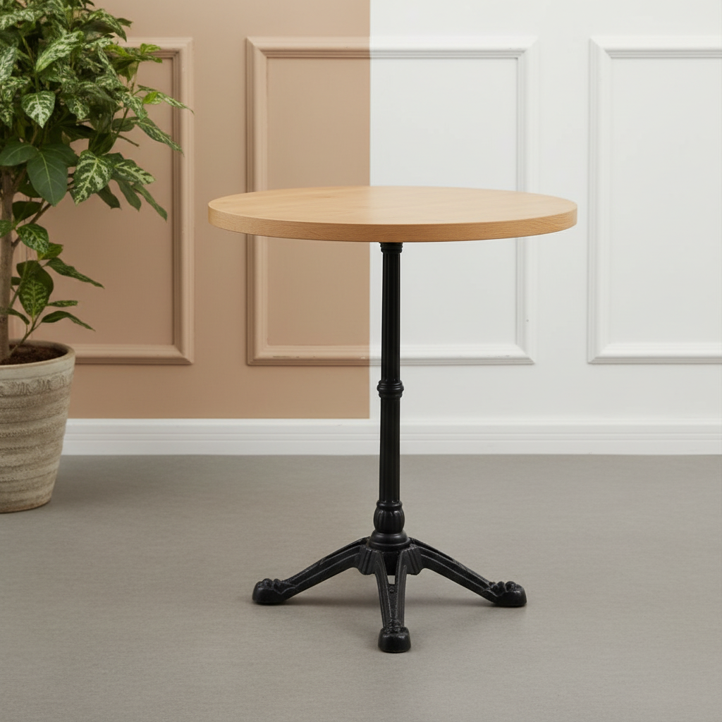İşletmenizin atmosferini yükseltirken operasyonel maliyetleri düşürmeyi hedefleyin. Parisien Serisi, yoğun müşteri trafiğine dayanacak şekilde tasarlanmıştır. Ağır ve sağlam siyah döküm demir ayak ve sütun detayı, devrilme riskini minimuma indirerek hem iç hem de dış mekanlarda kurumsal güvenilirlik ve uzun ömürlülük (Yatırım Getirisi) sağlar. Parlak, krem/bej tonlardaki tablası hızlı ve kolay silinebilir yapısıyla temizlik süresini kısaltır, hijyen standartlarınızın korunmasına yardımcı olur. Küçük ve yüksek yoğunluklu mekanlar için ideal olan bu zarif yuvarlak tasarım, müşterilerinize şık ve samimi, 'premium algı' sunan bir deneyim vaat eder. Mimarlar ve satınalma müdürleri için tasarlanmış, B2B dayanıklılıkta bir çözümdür.