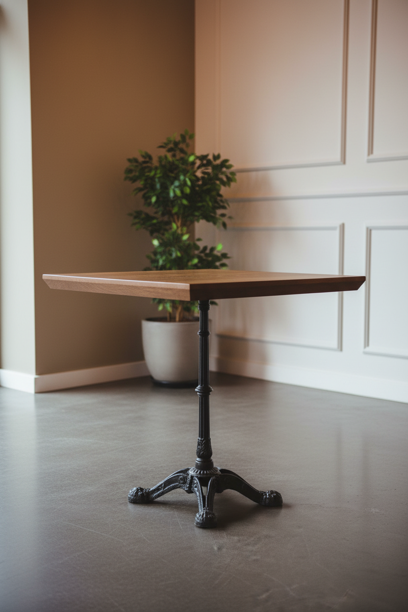 OTEL, KAFE ve RESTORAN işletmelerinin zorlu sirkülasyon ve hijyen standartlarına uyumlu olarak tasarlanan Döküm Loft Square 70, estetik ve dayanıklılığı birleştirir. Bu masa, sadece bir mobilya değil, müşteri deneyiminize ve yatırım getirinize (ROI) odaklanmış stratejik bir unsurdur. Masif ahşap üst tablası, yoğun kullanıma karşı üstün direnç gösterirken, özel işlem görmüş otantik döküm demir ayağı sarsılmaz bir stabilite sunar. Koyu renkli döküm detayları, mekanınıza anında premium ve kurumsal bir derinlik katar. Kolay temizlenebilir yüzey yapısı operasyonel maliyetlerinizi minimize eder ve uzun ömürlülüğü sayesinde yenileme giderlerini erteler. Mimarlar ve satınalma müdürleri için tasarlanmış güvenilir ve profesyonel bir tercihtir.